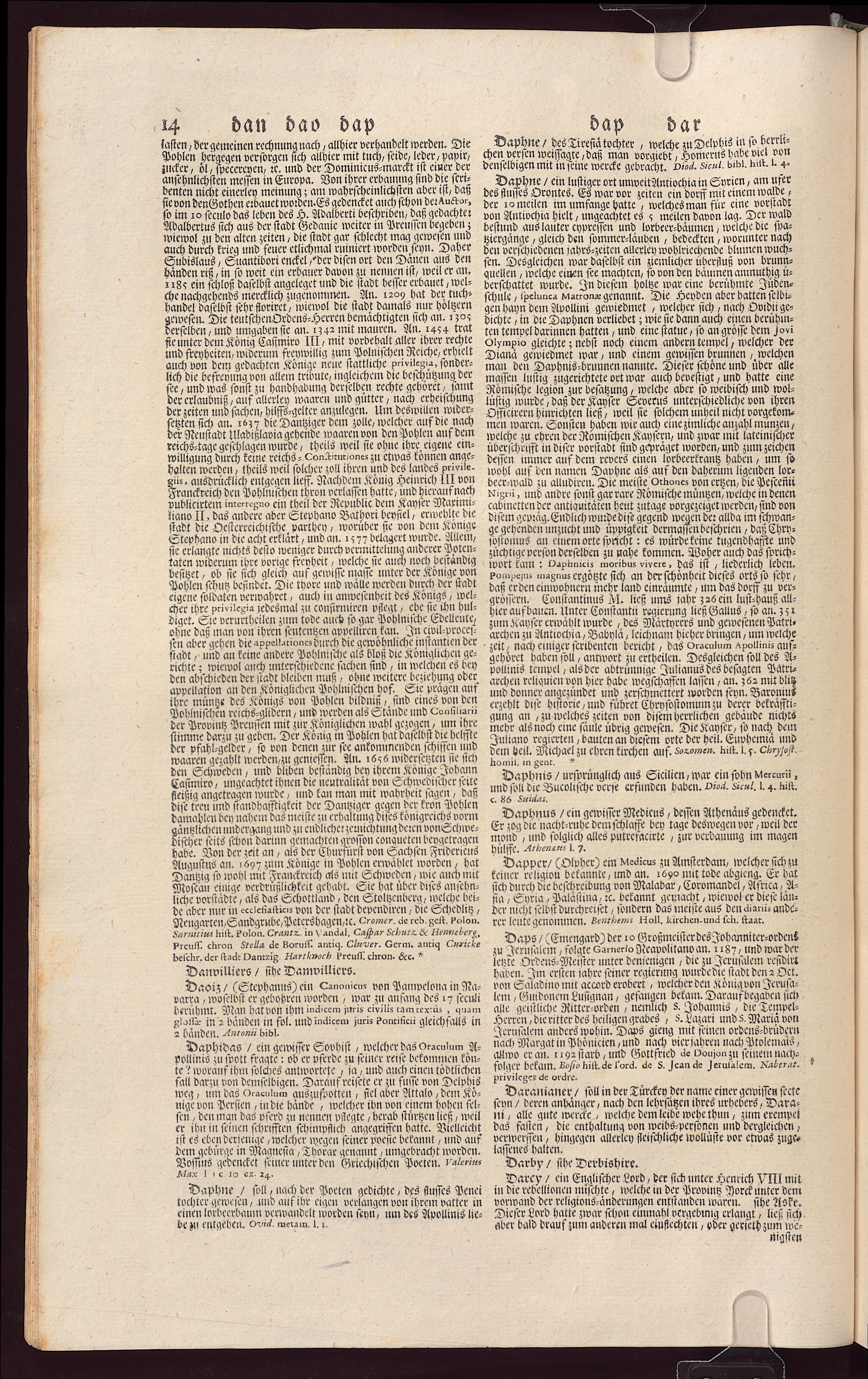 Daphne / ein lustiger ort unweitAmiochia in Syrien , am uftrdes flusses Orontes. Es war vor zeiten ein dorff mit einem walde,der 10 messen im umfange hatte , welches man für eine vorstadtvon Anliochia hielt, ungeachtet es 5 Meilen davon lag. Der waldbestund aus lauter cypressen und lorbeer-bäumen, welche die sva-tziergänge, gleich den fommer-länben , bedeckten, worunter nachden verschiedenen jahrs-zeitcn allerley wohlriechende dünnen wuch-sen. Desgleichen war daselbst ein ziemlicher Überfluß von brunn-quellen, welche eilten see machten, so von den bäumen anmuthig ü-berschattet wurde. In diefein holtze war eine berühmte Jüden-schule, lpciu^ genannt. Die Hcyden aber hatten selbi-gen hayn dem Avollini gewiedmet , welcher sich, nach Ovldii ge-dichte, in vrc Daphncn verliebet; wie sie dann auch einen berühm-ten tempel darinnen hatten, und eine statue, so an grosse demossmpio gleichce; nebst noch einem andern tempel, welcher derDianä gewiedmet war, und einem gewissen brunnen , welchenman den Daphnis-brunnen nannte. Dieser schöne und über alleMassen lustig zugerichtete ort war auch bevestigt, und hatte eineRömische legion zur besatzung^welche aber so weibisch und wol-lüstig wurde, daß der Kayser Severus unterschiedliche von ihrenOfficirern hinrichten ließ, weil sie solchem Unheil nicht vorgekom-men waren. Sonstcn haben wir auch einezimlichc auzahl münzen,welche zu ehren der Römischen Kayscrn, und zwar mit lateinischerüberschrifft in discr Vorstadt sind gepräget worden, und zum zeichendessen nmncr auf dem revcrs einen lorbeerkrantz haben, um sowohl auf den namcn Davhne als auf den daherüin iigeuden lor-beer-wald zu alludircn. Die meiste omonc; von ertzcn, die Pcseenii> und andre sonst gar rare Römische müntzcn, welche in denencabincrtendcr anliguitäccn beut zutage vorgezeiget werden, sind vondisem gepzäg.Endlich wurde dise gcgend wegen der allda im schwän-ge gehenden nnzucht und Üppigkeit dermasscnbeschrien, daß Chry-jbstomus au einem orte spricht: es würde keine tngendhasste undzüchtige vcrson derselben zu nahe kommen. Woher auch das sprich-wort kam l Oa^iiniciz moribur vivcre, das ist , liederlich leben.?oMt>L,»5 MSZiiur ergötzte sich an derschönheit dieses orts so sehr,daß erden cinwohnern mehr land einräumte, um das dorff zu ver-grösscrn. Constaminus ül. ließ ums jähr;26 ein iust-hauß all-hicr ausbauen. Unter Constantü regicrung ließ Gallus, so an. zzizum Kayser erwählt wurde ,deS Märtyrers und gewesenen Patri.archen zu Antiochia , Babvla, lcichnam hicher dringen, um welche- zeit, nach einiger scribenten bericht, daso^cuium apoiiiiNs aus-gehöret haben soll, antwort zu ertheilen. Desgleichen soll des A-pollinis tempel, alsdcr abtrünnige Julianus des besagten Pätri-archen reliquien von hier habe wegschaffen lassen, an. z ö2 mit blitzund donncr angezündet und zerschmettert worden ssyn. Baroniuserzehlt dise hiltoric,und führet Chrnsosromnm zu derer vekräffri-gung an , zu welches zeiten von dijem herrlichen gebäudc nichtsmehr als noch eine fäule übrig gewesen. Die Kayser, so nach demInliano regierten, bauten an diesem orte der heil. Euphemiä unddem heil. Michael zu ehren kirchcn auf. ü>n. l. s.