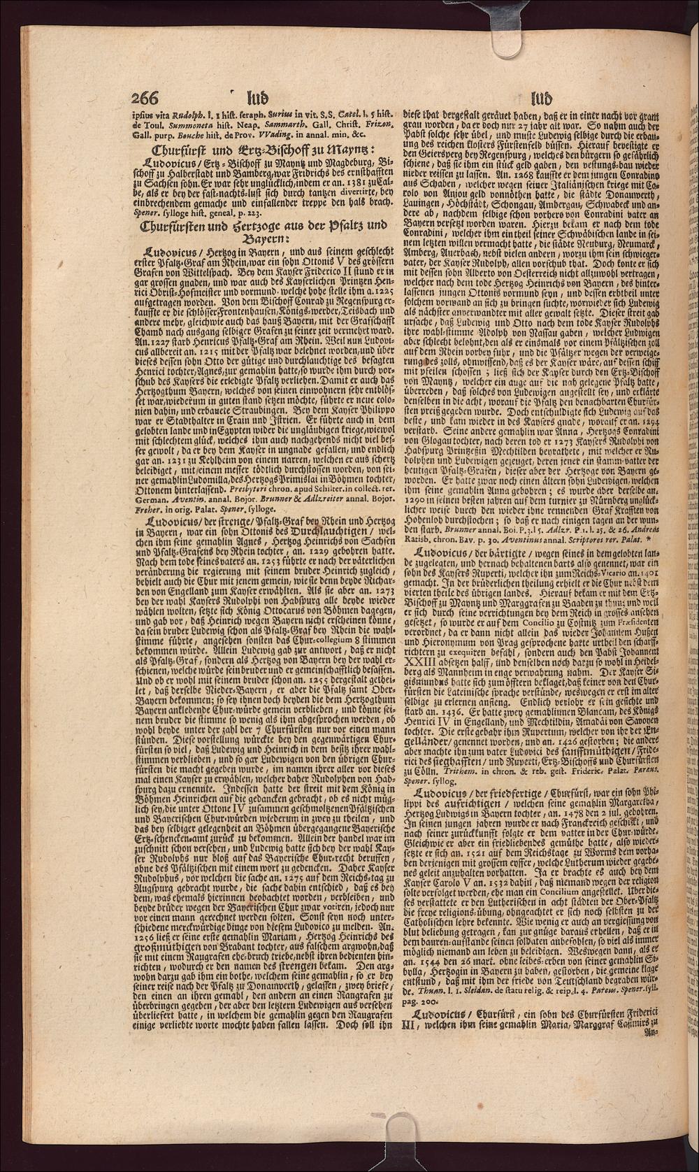 Ludovicus/ der strenge/ Pfaltz-Graf bey Rhein und Hertzogin Bayern , war ein söhn Ottonis des Durchlauchtigen / wel-chen ihm seine gemahlin Agnes, Hertzog Heinrichs von Sachsen und Pfaltz-Grafens bey Rhein tochter, an. 1229 gebvhren hatte.Nach dem rode feines Vaters an. 125; führte er nach der väterlichenVeränderung die regiernng mit seinem druder Heinrich zugleich,behielt auch die Chur mit jenem gemein, wie sie denn beyde Richar-den von Engelland zum Kayser erwählten. Als sie aber an. 127;bey der wähl Kaysers Rudolphi von Habspurg alle beyde wiederwählen wollen, setzte sich König Ottocarus von Böhmen dagegen,und gab vor, daß Heinrich wegen Bayern mcht erscheinen könne,dasein bruder Ludewig schon als Pfaltz-Graf bey Rhein die wähl-stimme führte, angesehen sonst«, das Chur-coU-gium 8 stimmenbekommen würde. Allein Ludewig gab zur antwort, daß er nichtals Pfaltz-Graf, sondern als Hertzog von Bayern bey der wähl er-schienen, welche würde sein bruder und er gemeinschaffllich besassen.Und ob er wohl mit seinem bruder schonan. 1255 dergestalt gethei»let, daß derselbe Nieder-Baycrn, er aber die Pfaltz samt Oder-Bayern bekommen; so sey ihnen doch beyden die dem HertzogthumBayern anklebende Chur -würde gemein verblieben, und könne sei-nem bruder die stimme so wenig als ihm abgesprochen werden, obwohl beyde unter der zahl der 7 Churfürsten nur vor einen mannstünden. Diese Vorstellung würckle bey den gegenwärtige» Chur-fürsten so viel, daß Ludewig und Heinrich in dem besitz ihrer wahl-stimmen verblieben, und so gar Ludcwigcn von den übrigen Chur-fürsten die macht gegeben wurde, im «amen ihrer aller vor diesesmal einen Kayser zu erwählen, welcher daher Rudolphen von Hab-spurg dazu ernennte. Indessen hatte der streit mit dem König inBöhmen Heinrichen aufdie gedancken gebracht, ob es nicht mög-lich sey,die unter Ottone IV zusammen geschmoltzenenPfältzischenund Bayerischen Cbur-würden wiederum in zwey zu theilen, unddas bey selbiger gtlegenhcit an Böhmen übergegangeneBayerischeErtz-schencken^iml zurück zubekommen. Allein der Handel war imzuschnitt schon versehen, und Ludewig hatte sich bey der wähl Kay-ser Rudolvhs nur bloß auf das Bay erische Chnr-recht beruffen,ohne des Pfältzischen mit einem wort zu gedenckcn. Daher KayserRndolphus, vor welchen die fache an. i27; auf dem Reichs-tag zuAngspurg gebracht wurde, die fache dabin entschied, daß es beydem, was ehemals hierinnen beobachtet worden, verbleiben, undbeyde brüder wegen der Bayerischen Cbur zwar vmiren, jedoch nurvor einen mann gerechnet werden sollen. Sonst seyn noch unter-schiedene merckwürdige dinge von diesem Ludovico zu melden. Ami2?6 ließ er seine erste gemahlin Mariam, Hertzog Heinrichs deSgroßmüthigen von Brabant tochter, aus falschem argwohn,daßsie mit einem Raugrafen ehe-brnch triebe,nebst ihren bedienten hin-richten , wodurch er den namm des strengen bekam. Den arg-wohn darzu gab ihm ein böthe, welchem feine gemahlin, so er beyseiner reise nach der Pfaltz zu Donauwerth, gelassen, zwey briefe,den einen an ihren gemahl, den andern an einen Raugrafen zuüberbringen gegeben, der aber den letztem Ludewigen aus versehenüberliefert hatte, in welchem die gemahlin gegen den Raugrafeneinige verliebte Worte mochte haben fallen lassen. Doch soll ihn