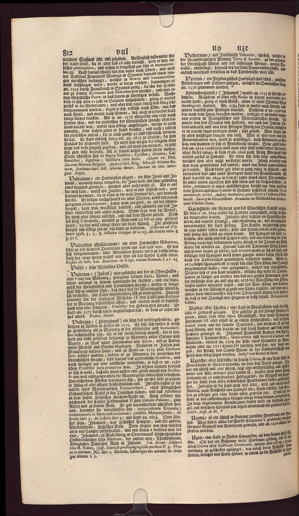 Vultejus / ( Justus) war gebürtig aus der in Ober-Hessen,eine mecke von Marpurg, gelegenen kleinen statt, Wetter, undlehrte anfangs in seinem vaterlande die rhelvric, und die logic,nebst der Griechischen und Laleinilchcn spräche; wobey er berge«statt sich in ansehen fetzte, baß ihrer viel d,e Marpurgische Universi-tät verliessen, um seiner Unterweisung sich zu uniergeden. Hieraufernennte ihn der Landgraf Wilhelm lV von CasselzumK-eickoreder in Marpurg befindlichen schule, und endlich ward er daselbst,nach dem tode Happclii, l^ot-ttor der Hebräi.chen spräche. Erstarb an. durch einen unglücklichen fall, in dem 46 jähre sei««es allers. k^eLe»-. rkearr.