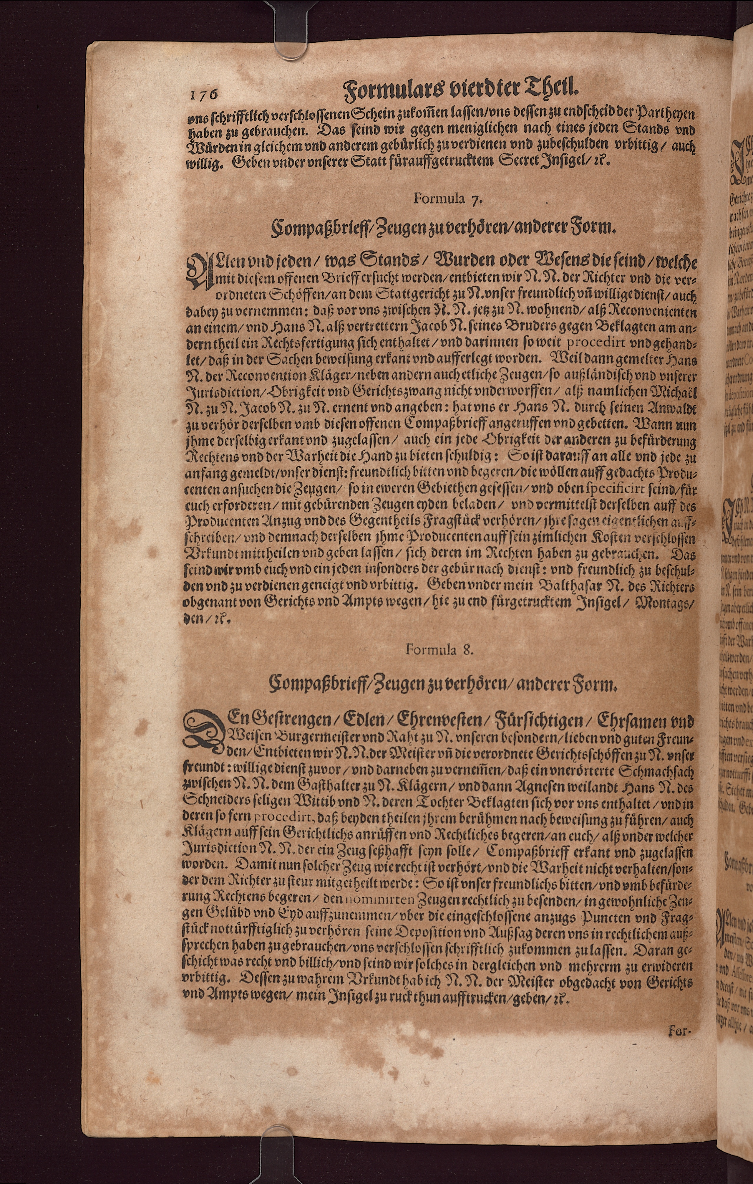Formula 8.Compaßbrieff/ Zeugen zu verhoͤren/ anderer Form.D Geſtrengen/ Edlen Ehrenveſten/ Fuͤrſichtigen/ Ehrſamen vnd