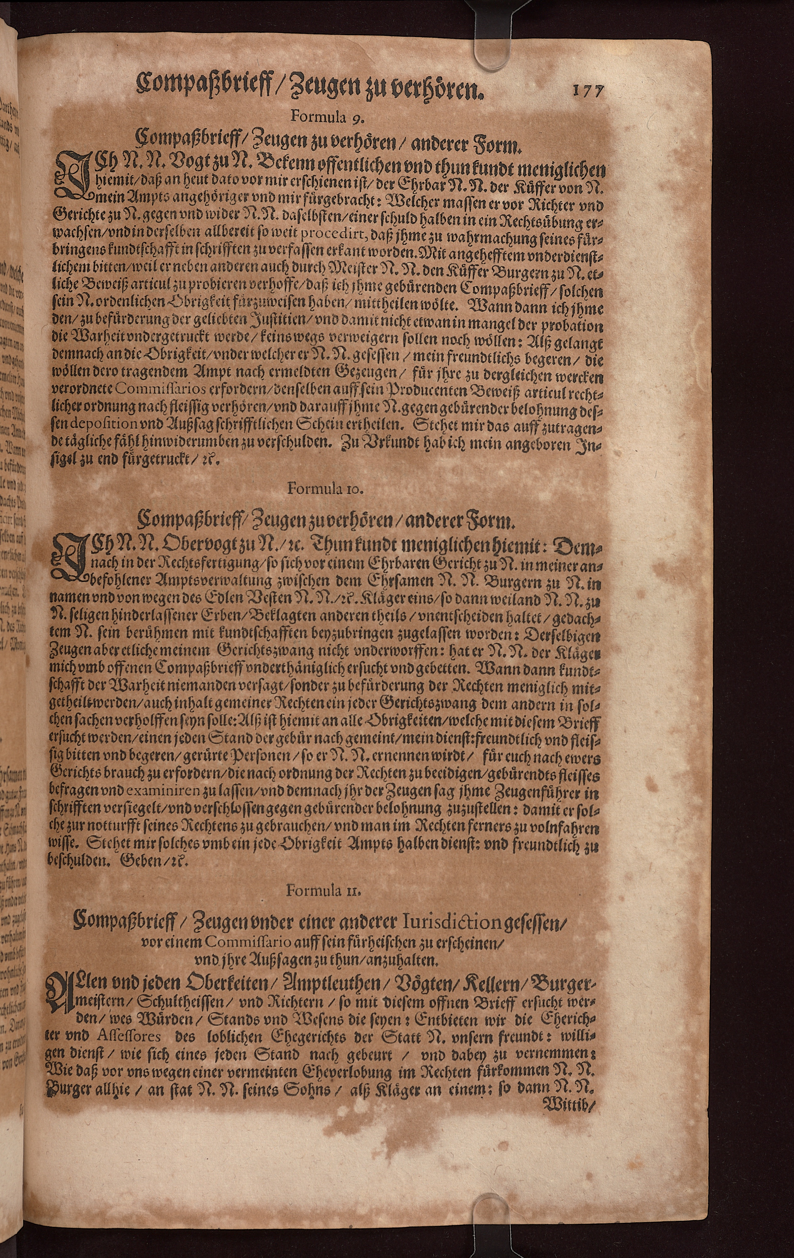 befohlener Amptsverwaltung zwiſchen dem Ehrſamen N. N. Burgern zu N. innamen vnd von wegen des Edlen Veſten N. N. 2. Kläger eins/ ſo dann weiland N. N. zuN. ſeligen hinderlaſſener Erben/ Beklagten anderen theils/ vnentſcheiden haltet/ gedach-tem N. fein berühmen mit kundtſchafften beyzubringen zugelaſſen worden: DerſelbigenZeugen aher etliche meinem Gerichtszwang nicht onderworffen: hat er N. N. der Klagenmich vmb offenen Compaßbrieff vnderthaͤniglich erſucht vnd gebeten. Wann dann kundt-ſchafft der Warheit niemanden verſagt/ ſonder zu befuͤrderung der Rechten meniglich mit-getheilt werden/ auch inhalt gemeiner Rechten ein jeder Gerichtszwang dem andern in ſol-chen ſachen verholffen ſeyn ſolle: Alß iſt hiemit an alle Obrigkeiten/welche mit dieſem Briefferſucht werden/ einen jeden Stand der gebůr nach gemeint/ mein dienſt: freundtlich vnd fleifzfig bitten vnd begeren, gerürte Perſonen/ fo er N. N. ernennen wirdt/ für euch nach ewersGerichts brauch zu erfordern/ die nach ordnung der Rechten zu beeidigen/gebůͤrendts fleiſſesbefragen vnd examiniren zu laſſen/ vnd demnach jhr der Zeugen ſag jhme Zeugenführer inſchrifften verſiegelt/ vnd verſchloſſen gegen gebuͤrender belohnung zuzuſtellen: damit er ſol-che zur notturfft feines Rechtens zu gebrauchen/ vnd man im Rechten ferners zu volnfahrenwiſſe. Stehen mir ſolches vmb ein jede Ohrigkeit Ampts halben dienſt: vnd freundtlich zu