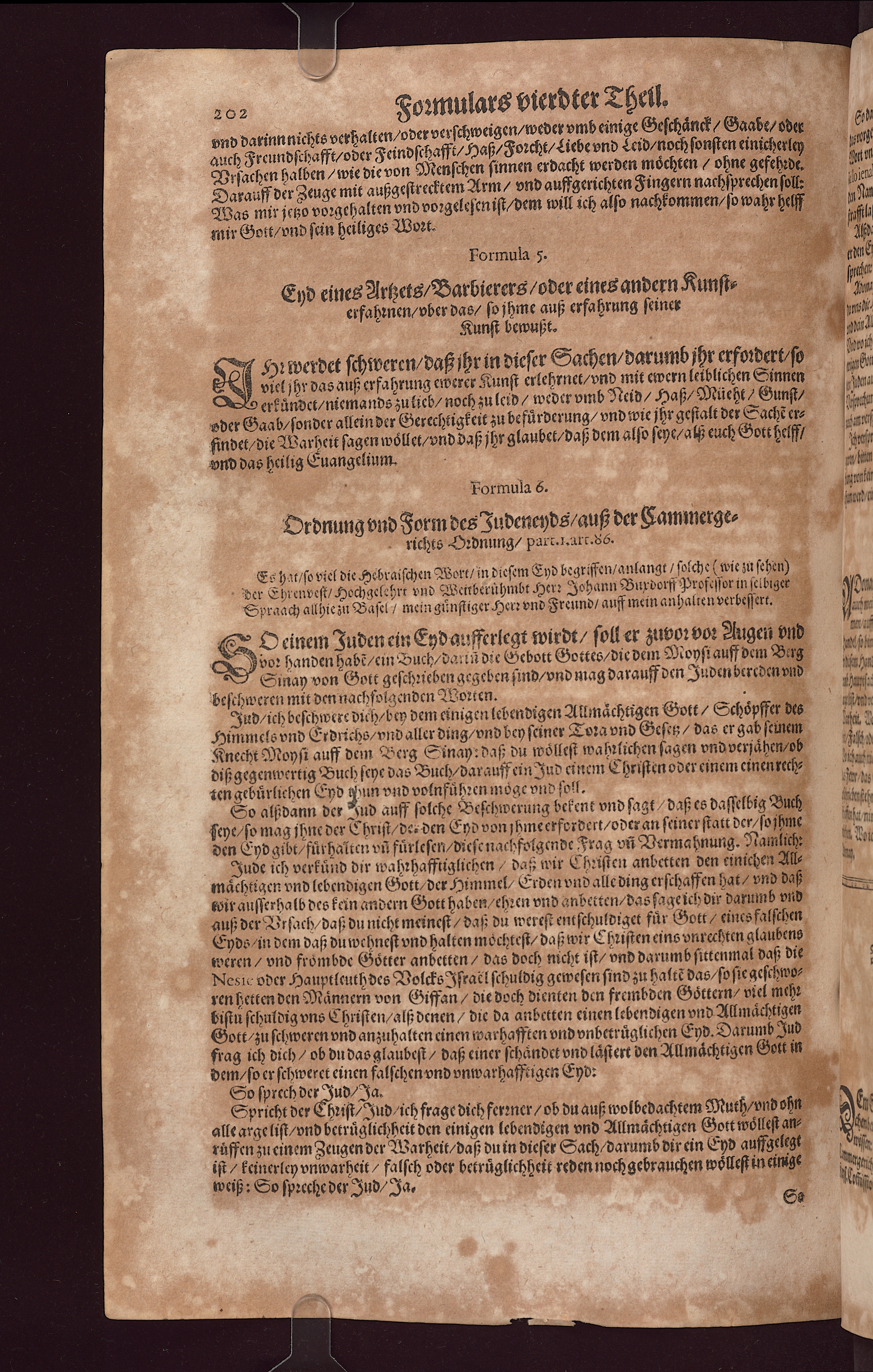 Ordnung vnd Form des Judeneyds/ auß der Fammerge-richts Oꝛdnung/ part. 1.1rt. 6.Es hat/ ſo viel die Hebraiſchen Wort/ in dieſem Eyd begriffen/ anlangt ſolche(wie zu ſehen)Der Ehrenveſt/ Hochgelehrt vnd Weirberühmbt Herz Johann Buxdorff Profeſſor in ſelbigerSypraach allhie zu Baſel / mein gůnſtiger Herz vnd Freund/ auff mein anhalten verbeſſert.
