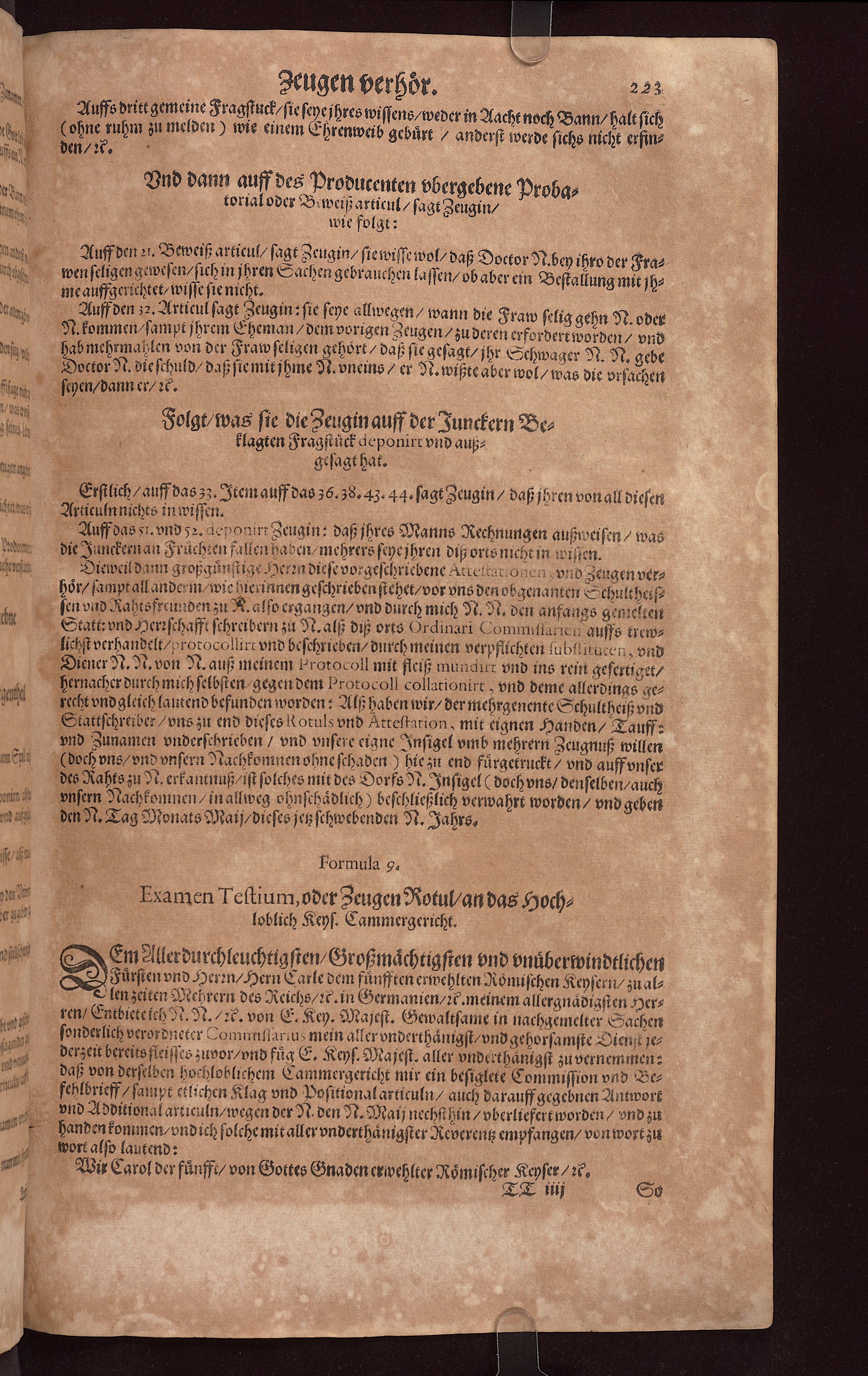 Dieweil dann großguͤnſtige Herrn dieſe vorgeſchriebene Arteitat onen„949 Zeugen ver-hoͤr/ ſampt all anderm /wie hierinnen geſchrieben ſtehet/ vor vns den obgenanten Schultheiſ-fen vnd Rahtofreunden zu R. alſo ergangen/ vnd durch mich N. N. den anfangs gemnieltenStatt: vnd Herꝛſchafft ſchreibern zu N. alß diß orts Ordinari Commiſſarien auffs trew-lichſt verhandelt rotocollirt vnd beſchrieben/ durch meinen verpflichten lubllitücen, vnd