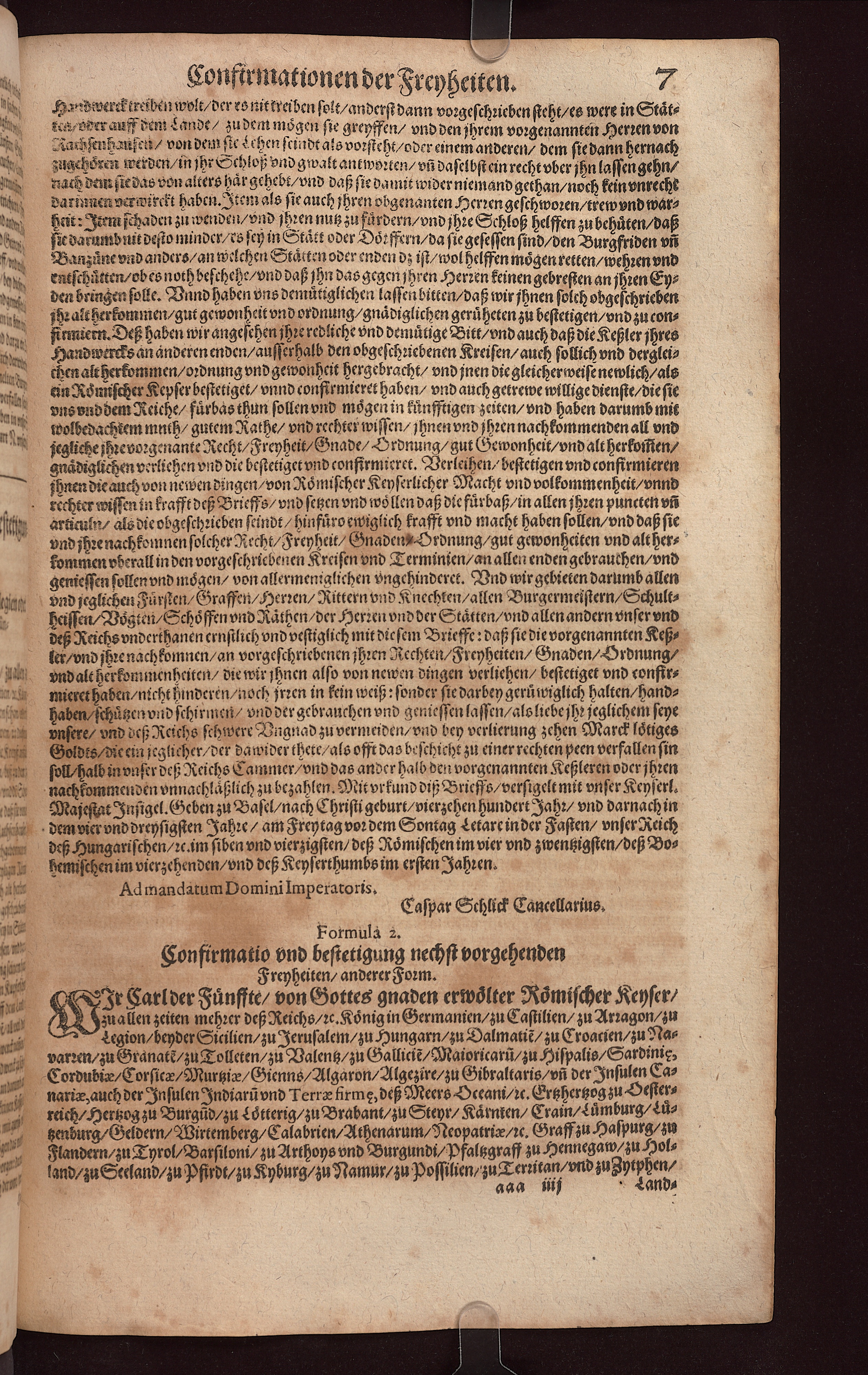 Formula 2.Confirmatio vnd beſtetigung nechſt vorgehendenFreyheiten/ anderer Foꝛm.|Ir Carl der Fuͤnffte/ von Gottes gnaden erwölter Romifcher Keyſer/In allen zeiten mehꝛer deß Reichs /ꝛc. König in Germanien zu Caſtilien , zu Arꝛagon zuLegion/ heyder Sicilien/ zu Jeruſalem / zu Hungarn/ zu Dalmatiẽ/ zu Croacien/ zu Na-varꝛen/ zu Granatk/ zu Tolleten/ zů Valentz/ zu Gallickẽ/ Maioricarũ/ zu Hiſpalis/Sardinię ,Cordubiæ /Corſicæ/ Murtzlx/ Gienns/Algaron/ Algezire/ zu Gibraltaris/ vñ der Inſulen Ca-nariæ, auch der Inſulen Indiarũ vnd Terræ firmę, deß Meers Oceanic. Ertzhertz og zu Deſter-reich/ wertzog zu Burgud/ zu Loͤtterig/ zu Brabant/ zu Steyr / Kärnten , C rain/ zùmburg/ Luͤ-tenzurg/ Geldern/ Wirtemberg/ Calabrien/Athenarum/Neopatriæ rc. Graff zu Haſpurg zuFlandern / ju Tyrol /Barſiloni, zu Arthoys vnd Burgundi, Pfaltzgraff zu Hennega mw zu Hol land