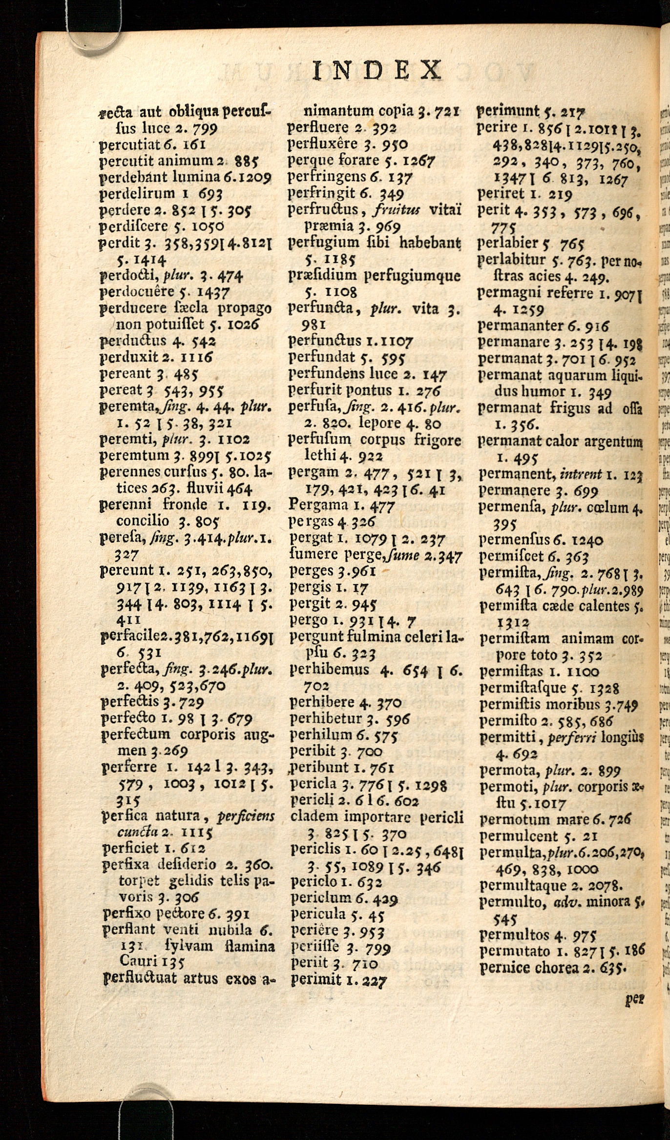 perhibere 4. 570perhibetur 5. 596perhilum 6. 575peribit 5. 700peribunt 1. 761pericla 5. 7761 5. 1298pericli 2. 616. 602cladem importare pericli3 8251 5. 570periclis 1. 60 12.25,64813 55, 1089 15- 346periclo 1. 652periclum 6. 42Apericula 5. 4;periere 5. 955pcriiife 3. 799periit ?. 710perimit 1.327