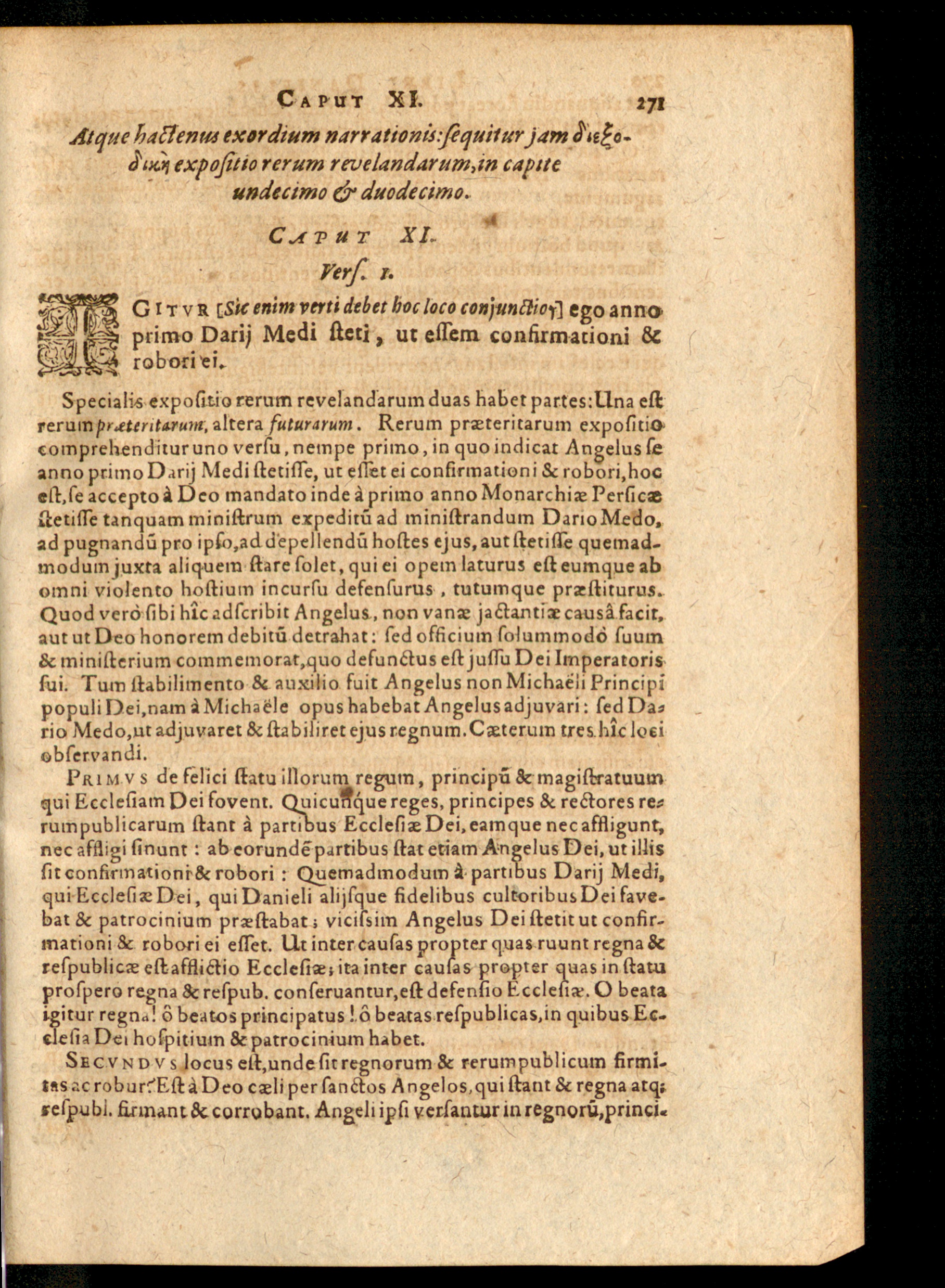 Specialis expofitio rerum revelandarum duas habet partes:llna eftrerumpr.eteritarunm, altera futurarum, Rerum preteritarum expofitiocomprehendituruno verfu, nempe primo, in quoindicat Angelus feanno primo Darij Medi ftetiffe, ut effet ei confirmationi& robori,hoceít,(e acceptoà Deo mandato indeà primo anno Monarchiz Períiceftetiffe tanquam mini&rum expeditü ad miniftrandum Dario Medo,ad pugnandü pro ipfo,ad depellendü hoftes ejus, aut ftetiffe quemad-modum juxta aliquem ftare folet, qui ei opemlaturus efteumque abomni violento hoftium incurfu defeníurus, tutumque prazfíltiturus.Quod veró(ibi hic adfcribit Angelus, non vanz jactantiz causá facit,aut ut Deo honorem debitü detrahat: fed officium folummodó fuum& miniíterium commemorat,quo defunctus eft juffu Dei Imperatorisfui. Tum ftabilimento& auxilio fuit Angelus non Michaéii Principipopuli Dei,nam à Michaéle opus habebat Angelusadjuvari: fed Dasrio Medo,utadjuvaret& ftabiliret ejus regnum. Caterum tres hic loeiobfervandi.