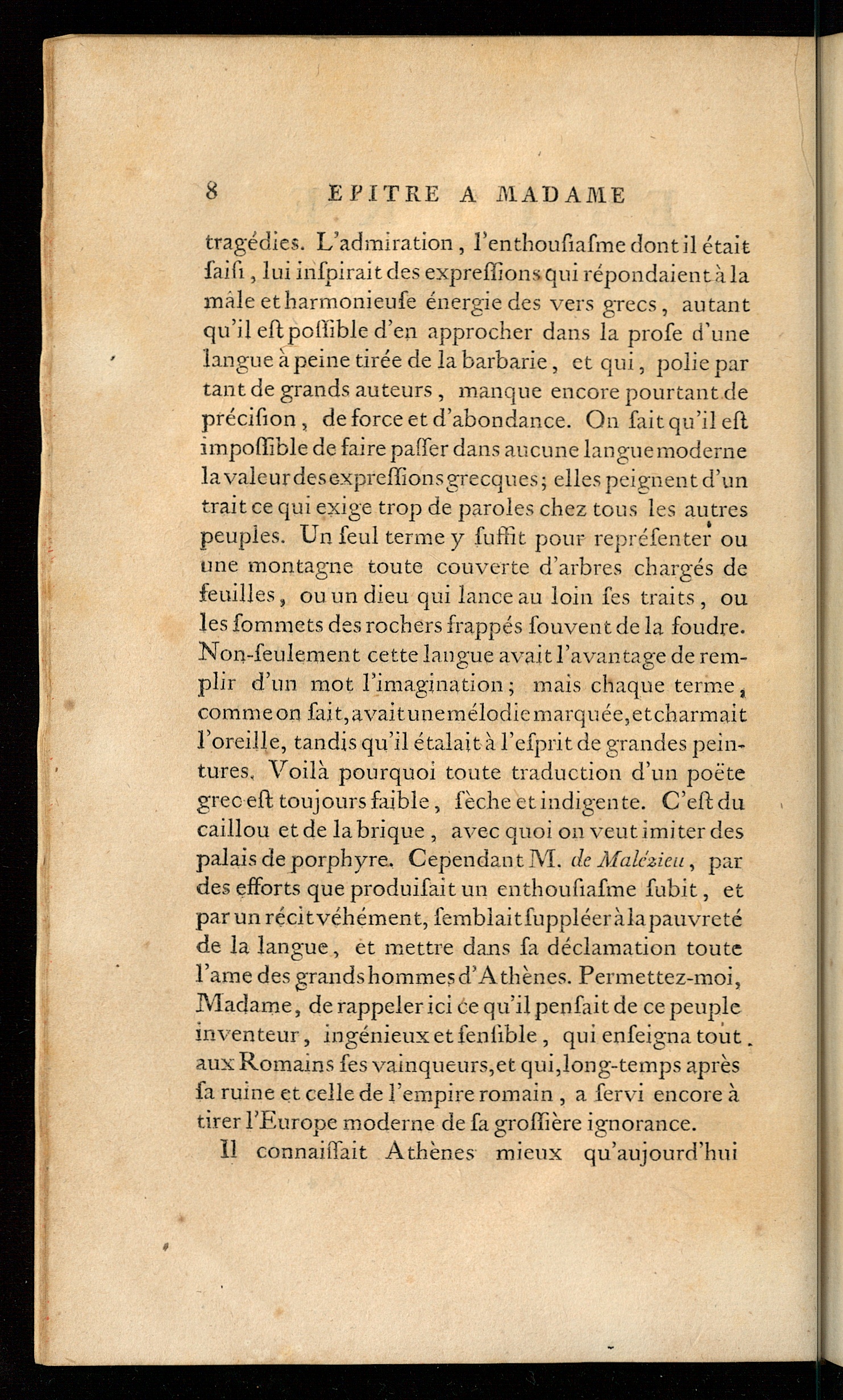 tragédies. L’admiration, l’enthoufiafme dont il étaitfaifi, lui infpiraitdes expreffions qui répondaient à lamale etharmonieufe énergie des vers grecs, autantqu’il eftpoffible d’en approcher dans la proie d’unelangue à peine tirée de la barbarie, et qui, polie partant de grands auteurs , manque encore pourtant deprécifion, de force et d’abondance. On fait qu’il efl.impoffible de faire palfer dans aucune langue modernelavaleurdese-xprefïionsgrecques; elles peignent d’untrait ce qui exige trop de paroles chez tous les autrespeuples. Un feul terme y fuffît pour repréfenter ouune montagne toute couverte d’arbres chargés defeuilles, ou un dieu qui lance au loin fes traits , oules fommets des rochers frappés fouvent de la foudre.Non-feulement cette langue avait l’avantage de rem-plir d’un mot l’imagination ; mais chaque terme,comme on fait, avaitunemélodie marquée, etcharmaitl’oreille, tandis qu’il étalait à l’efprit de grandes pein-tures. Voilà pourquoi toute traduction d’un poètegrec eft toujours faible, fèche et indigente. C’eftducaillou et de la brique , avec quoi on veut uni ter despalais de porphyre. Cependant ]\ï. de Afalc'zieu, pardes efforts que produifait un enthoufiafme fubit, etpar un récit véhément, femblaitfuppléeràlapauvretéde la langue, et mettre dans fa déclamation toutel’amedesgrandshommesd’Athènes . Permettez-moi,Madame, de rappeler ici ce qu’il penfait de ce peupleinventeur, ingénieux etfenfible, qui enfeigna tout.aux Romains fes vainqueurs,et qui,long-temps aprèsfa ruine et celle de l’empire romain , a fervi encore àtirer l’Europe moderne de fa groffière ignorance.