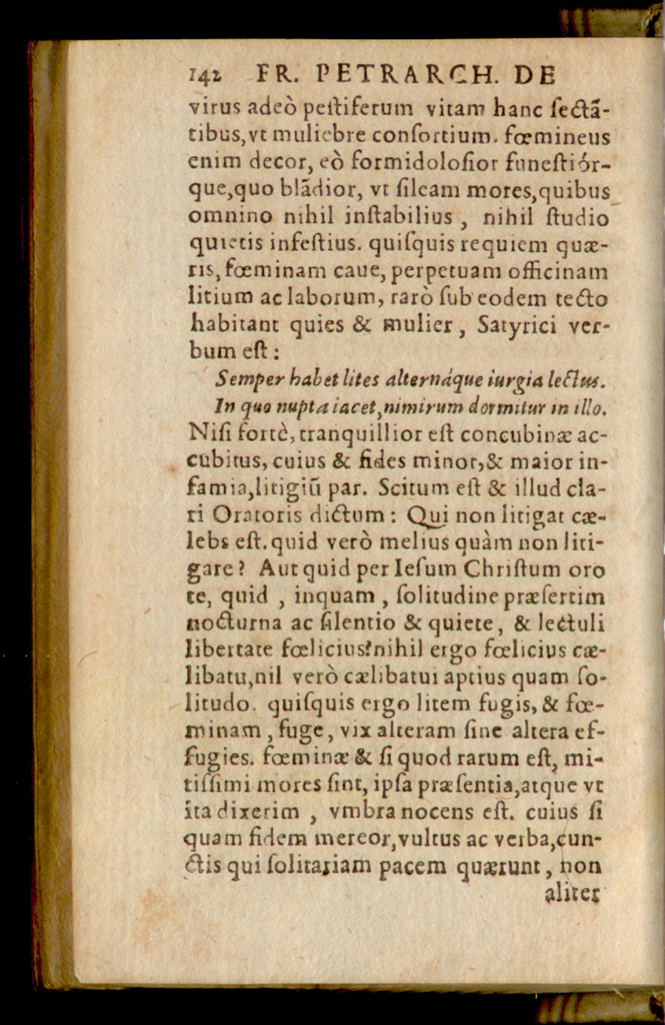 virus adeó peitiferum vitam hanc fe&ti-tibus,vt muliebre confortium. foemineusenim decor, eó formidolofior funeftiór-que,quo bládior, vt fileam mores, quibusomnino nihil inftabilius, nihil ftudioquietis infeftius. quifquis requiem quz-ri5, foeminam caue, perpetuam officinamlitium aclaborum, raró fub eodem te&ohabitant quies& mulier, Satyrici ver-bum eft: