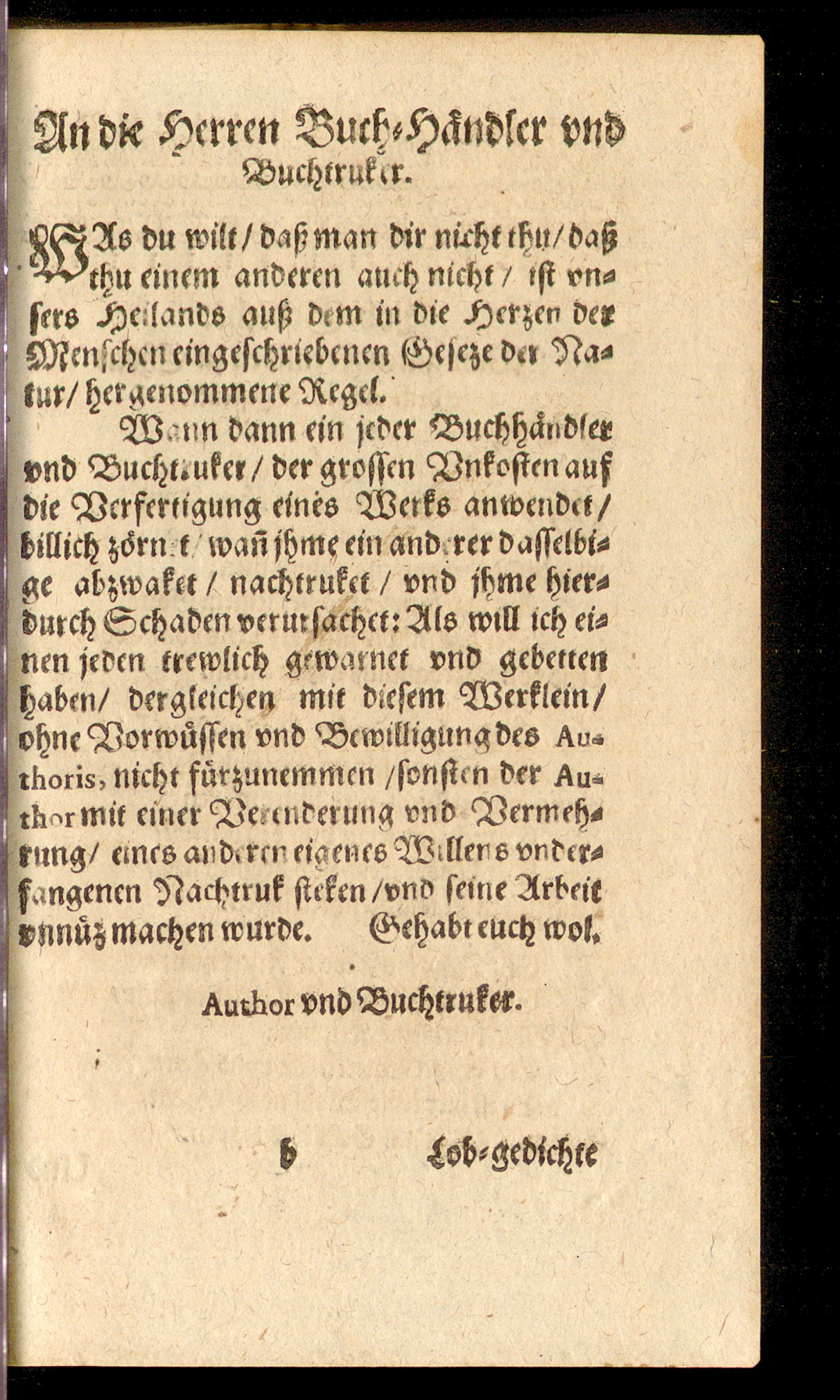 Wann dann ein jeder Buchhaͤndſervnd Buchtiuker/ der groſſen Vnkoſten aufdie Verfertigung eines Werks anwendet/billich zoͤrn t wañ ſhme ein and rer daſſelbi-ge abzwaket/ nachtruket/ vnd jhme hier-durch Schaden verurſachet: Als will ich ei-