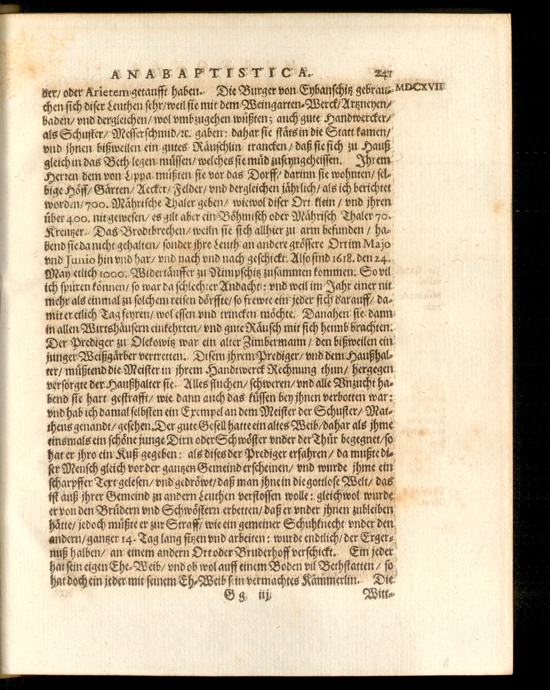 chen ſich diſer Leuthen ſehr/ weil fie mit dem Weingarten Werck/ Art neyen/baden/ vnd dergleichen/ wol vmbzugehen wußten; auch gute Hand wercker/als Schuſter/ Meſſerſchmid/ ꝛ⸗c gaben: dahar fie ſtats in die Statt kamenvnd jhnen bißweilen ein gutes Raͤuſchlin trancken/ daß fie ſich zu Haußgleich in das Beth legen muͤſſen/ welches ſie muͤd zuſeyngeheiſſen. IhremHerien dem von Lppa mußten ſie vor das Dorff/ darin fie wohnten/ ſel-bige Hoͤff/ Garten/ Aecker/ Felder/ vnd dergleichen jährlich/ als ich berichtetworden 700: Maͤhriſche Thaler geben/ wie wol diſer Ort klein/ vnd jhrenüber 400. nit geweſen/ es gilt aber ein Boͤhmiſch oder Maͤhriſch Thaler 70.Kreutzer Das Brodtbrechen/ weiln fe ſich allhier zu arm befunden/ hasbend ſie da nicht gehalten/ ſonder jhre Leuth an andere groͤſere Ortim Majovnd ſunio hin vnd har/ vnd nach vnd nach geſchickt Alſo ſind i618. den 24.Ma etlich ooo. Widertaͤuffer zu Nimpſchitz zuſammen kommen. So vilich ſpuͤren können/ fo war da ſchlechter Andacht: vnd weil im Jahr einer nitmehr als einmal zu ſolchem reifen doͤrffte fo frewte ein jeder ich dar auff/ da-mit er etlich Tag feyren/ wol eſſen vnd trincken moͤchte. Danahen ſie dannin allen Wirtshaͤuſern einkehrten/ vnd gute Raͤuſch mit ſich heimb brachten.Der Prediger zu Oletowitz war ein alter Zimbertnann/ den bißweilen einjunger Weißgaͤrber vertretten. Diſem jhrem Prediger/ vnd dem Haußhal-ter/ muͤßtend die Meiſter in jhrem Handtwerck Rechnung thun/ hergegenverſorgte der Haußhalter ſie. Alles fluchen/ ſchweren/ vnd alle Vnzucht hasbend fe hart geſtrafft/ wie dann auch das kuͤſſen bey jhnen verbotten war:vnd hab ich damal ſelbſten ein Exempel an dem Meiſter der Schuſter/ Mat-thens genandt/ geſchen. Der gute Geſell hatte ein altes Weib dahar als jhmeeins mals ein ſchoͤne junge Dirn oder Sch woͤſter vnder der Thur begegnet/ ſohat er jhro ein Kuß gegeben: als diſes der Prediger erfahren/ da mußte diefer Menſch gleich vor der ganzen Gemeind erſcheinen/ vnd wurde jhme einſcharpffer Text geleſen/ vnd gedroͤwt/ daß man jhne in die gottloſe Welt/ dasiſt auß jhrer Gemeind zu andern Leuthen verſtoſſen wolle: gleichwol wurdeer von den Bruͤdern vnd Schwoͤſtern erbetten/ daß er vnder jhnen zubleibenhaͤtte/ jedoch mußte er zur. wie ein gemeiner Schuhknecht vnder denandern/ gantzer 14. Tag lang fisen vnd arbeiten: wurde endtlich/ der Erger-nuß halben/ an einem andern Ort oder Bruderhoff verſchickt. Ein jederhat fein eigen Ehe⸗Weib/ vnd ob wol auff einem Boden vil Bethſtatten, fühat doch ein j: der mit ſeinem Eh⸗Weib ſ in vermachtes Kammerlin. Die