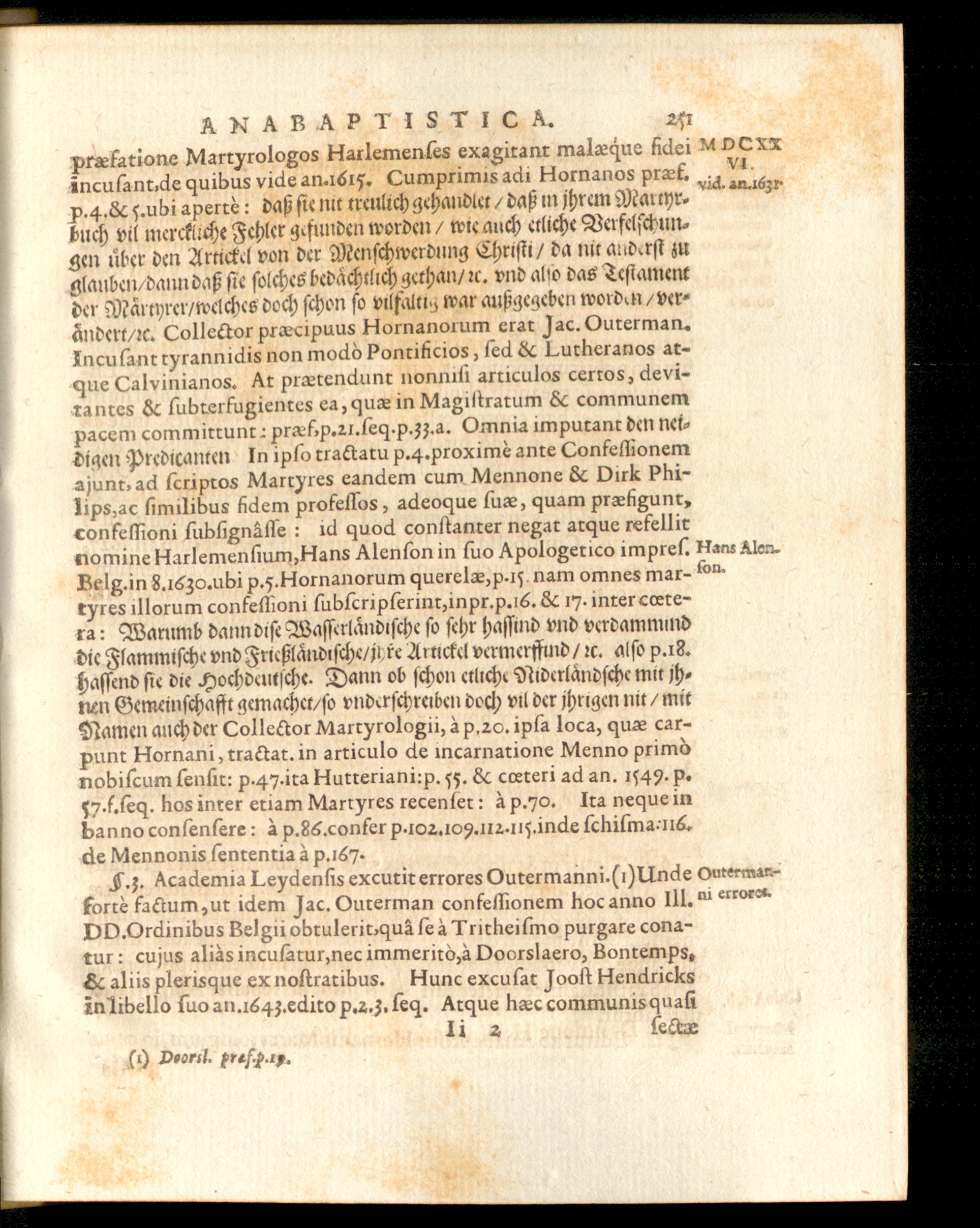 AÆANABAPTIST IC A. 25præfatione Martyrologos Harlemenſes exagitant malæque fideiincuſant. de quibus vide an. i615. Cumprimis adi Hornanos præt.p. 4.& 5. ubi apertè: daß fie nit treulich gehandlet/ daß in jhrem Martyr-huch vil merckliche Fehler gefunden worden, wie auch etliche Verfelſchun-gen uͤber den Artickel von der Menſchwerdung Chriſti/ da nit gnderſt zuglauben/ dann daß ſie ſolches bedaͤchtlich gethan/ ꝛc. vnd alſo das Teſtamentder Maͤrtyrer/ welches doch ſchon fo vilfaltiz war außgegeben worden/ ver=andert ac. Collector preæcipuus Hornanorum erat Jac. Quterman.Incuſant tyrannidis non modò Pontificios, ſed& Lutheranos at-que Calvinianos. At prætendunt nonniſi articulos certos, devi-antes& ſubterfugientes ea, quæ in Magiſtratum& communempacem committunt: præf, p. 2I. ſeq. p.33. 4. Omnia imputant den nei-digen Predicanten In ipſo tractatu p. 4. proximè ante Confeſſionemajunt; ad ſcriptos Martyres eandem cum Mennone& Dirk Phi-Iips ac ſimilibus fidem profeſſos, adeoque ſuæ, quam præfigunt,confeſſioni ſubſignaſſe: id quod conſtanter negat atque refellit