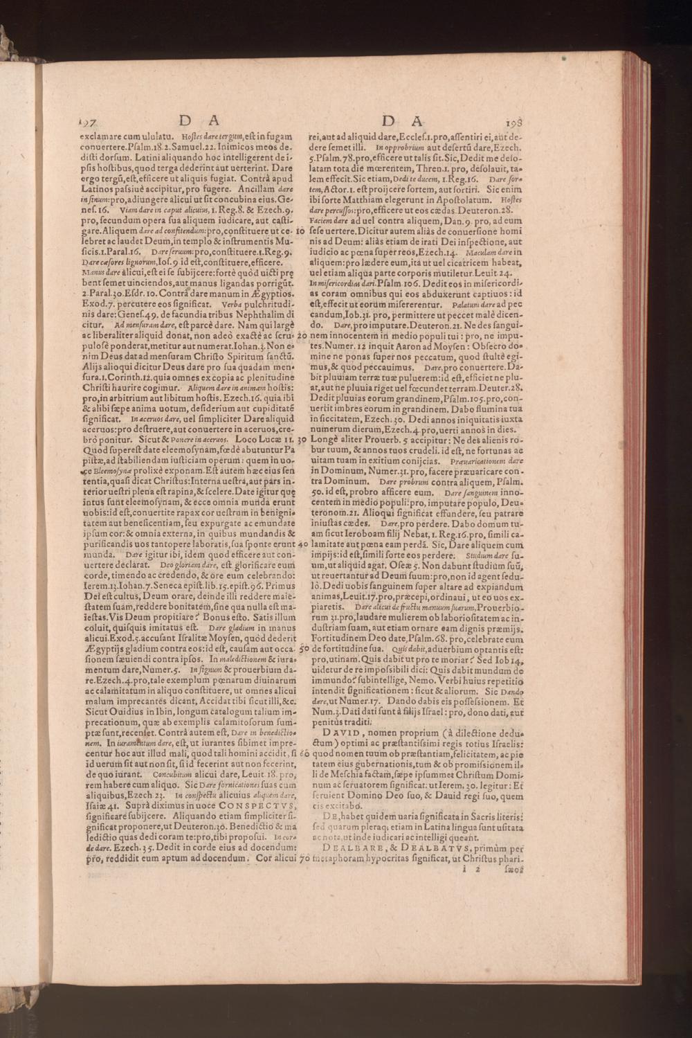 D. A 198rei,aut ad aliquid dare, Ecclef.t.pro,affentiri ei, 2üt de-derefemetilli. Inopprobrium aut defertü dare, Ezech.5.Pfalm.78.pro,efficere ut talis fit.Sic, Dedit me delo-latam tota die moereritem, Thren.r. pro, defolauit, ta»lem effecit.Sic etiam, Dedi te ducem, 1.Reg.16.— Dare foretem, A Ctor.1. eftproijcere fortem, autfortiri. Sicenimibiforte Matthiam elegerunt in Apoftolatum.| Hoflesdare percu[fos:pro,efficere ut eos cedas.Deuteron.28.Faciem dare ad uel contra aliquem, Dan.9. pro, ad eum