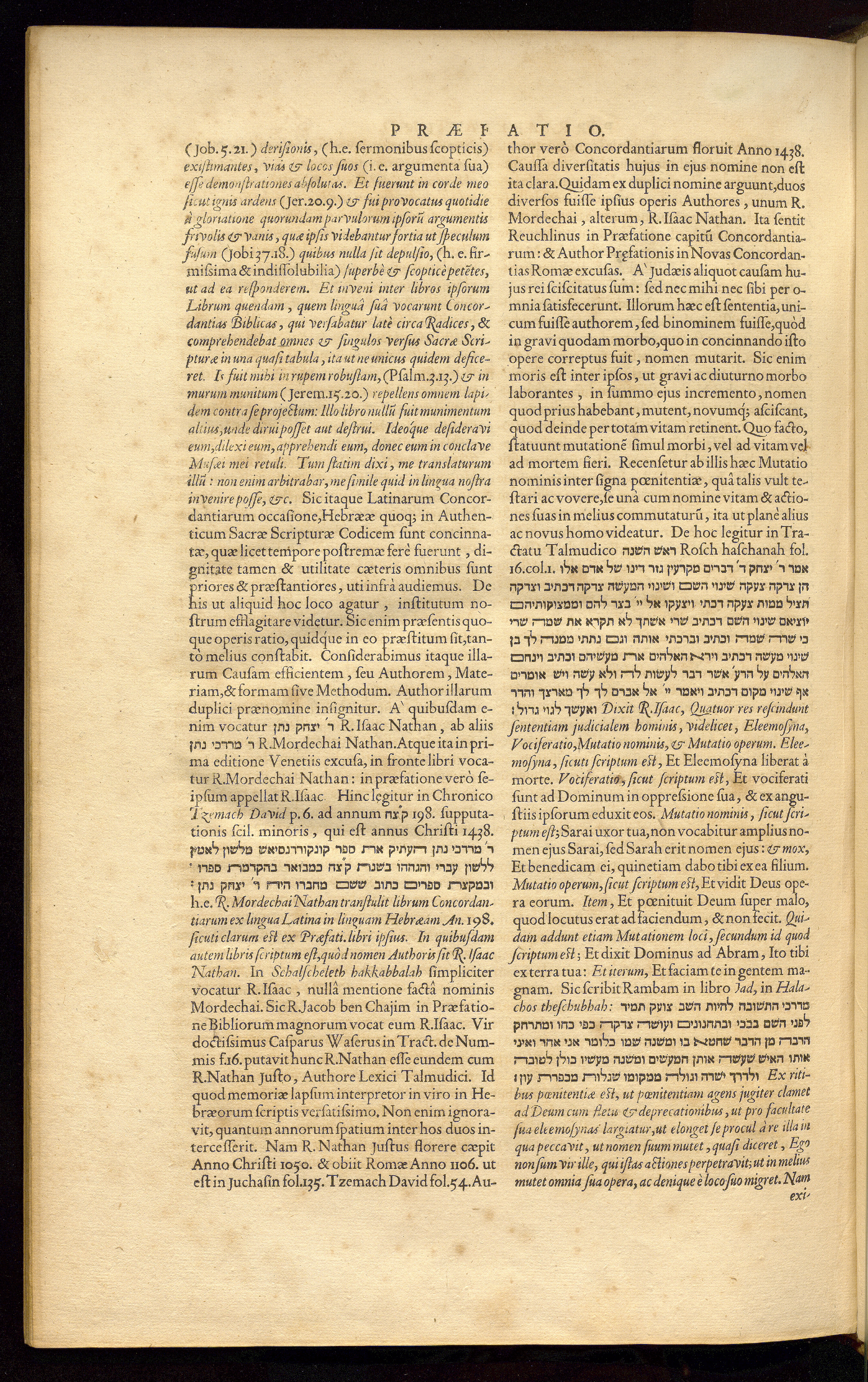 Iohannis Buxtorfii Concordantiae Bibliorum Hebraicae : nova et artificiosa methodo dispositae, in locis innumeris depravatis emendatae, deficientibus plurimis expletae, Radicibus antea confusis distinctae, & significatione vocum omnium Latina illustratae : quibus Primum locus quaesitus quasi in momento ostenditur, aut facillimo iucundissimoque labore invenitur : Secundo lexici Hebraici omnibus vocibus flexilibus completi, forma absoluta proponitur : Denique Masora sive Critice perfecta, quoties, qua forma, quo libro, cap. & versu unaquaeque vox declinabilis in textu Hebraeo invenitur, numerato traditur : Accesserunt novae concordantiae Chaldaicae omnium vocum, quae Corpore Bibliorum Hebraico continentur : Cum Praefatione, qua Operis usus abunde declaratur / Per Iohannem Buxtorfium Fil. Ling. Sanctae in Acad. Bas. Prof. ordinar.