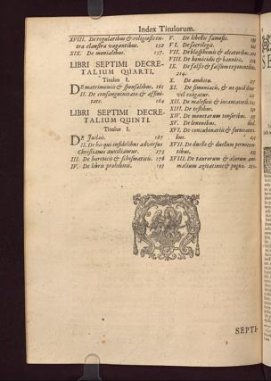 Corpus iuris canonici emendatum et notis illustratum : Gregorii XIII. Pontif. Max. iussu editum : Indicibus variis, novisque et appendice Pauli Lancellotti Perusini adauctum: cuius partes indicat aversa pagina. Accesserunt Novissime Loci communes uberrimi, summa diligentia ex ipsis Canonibus collecti, & ordine ac methodo singulari ad usum Fori utriusque fideliter digesti: Theologis, Politicis, & Practicis pernecessarii. Itemque Liber VII. Decretalium Novis aliquot Constitutionibus auctus