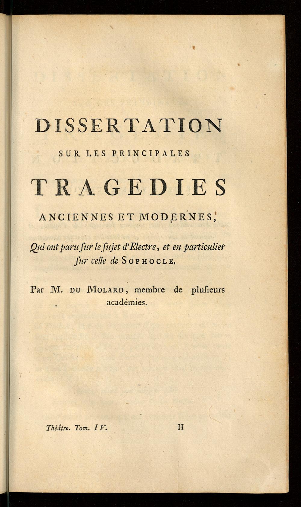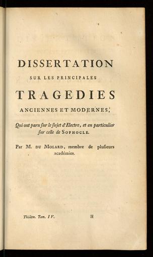 Dissertation sur les principales tragédies [...] sur le sujet d'Electre, et en particulier[...]