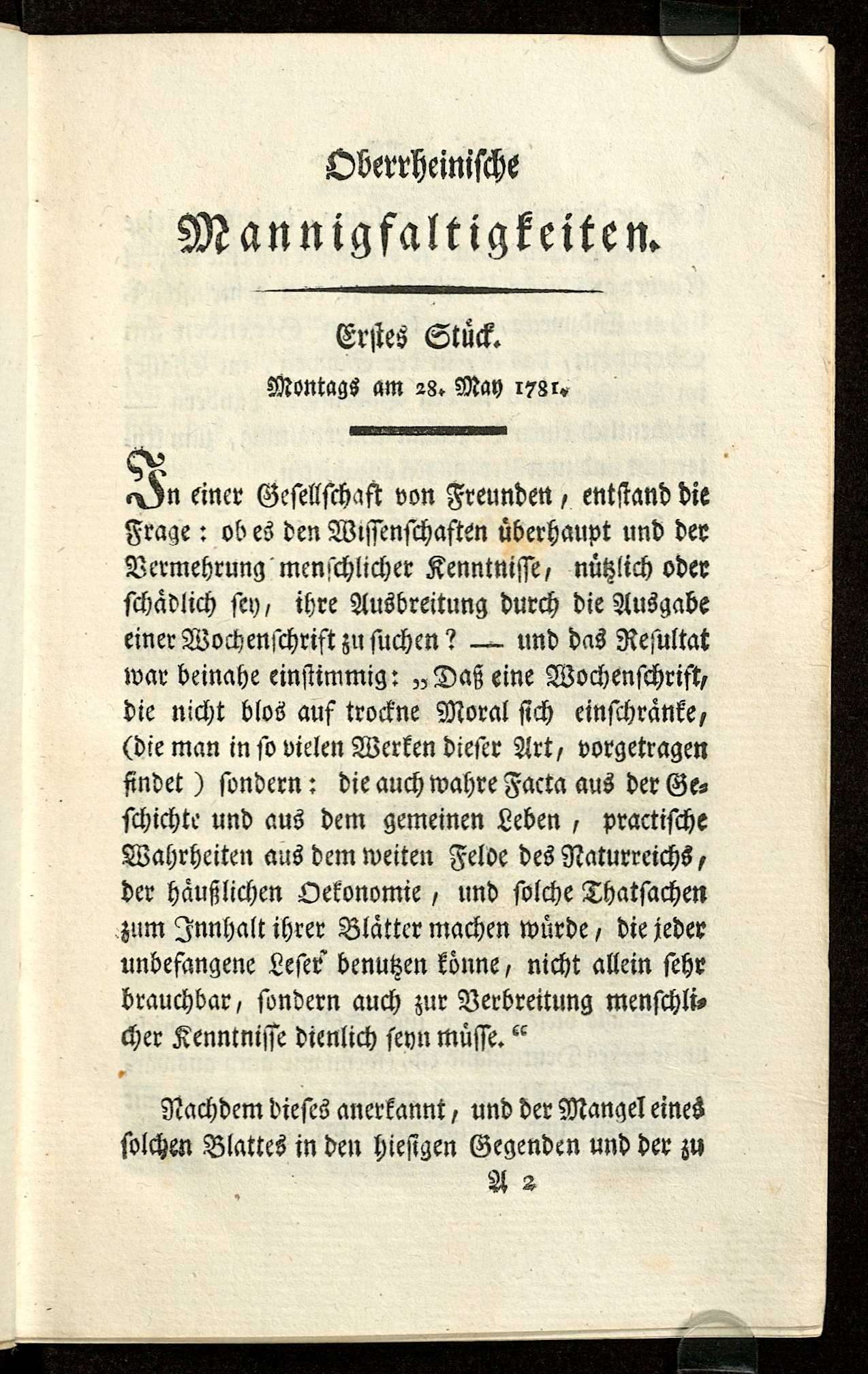 Erstes Stück. Montags am 28. May 1781.