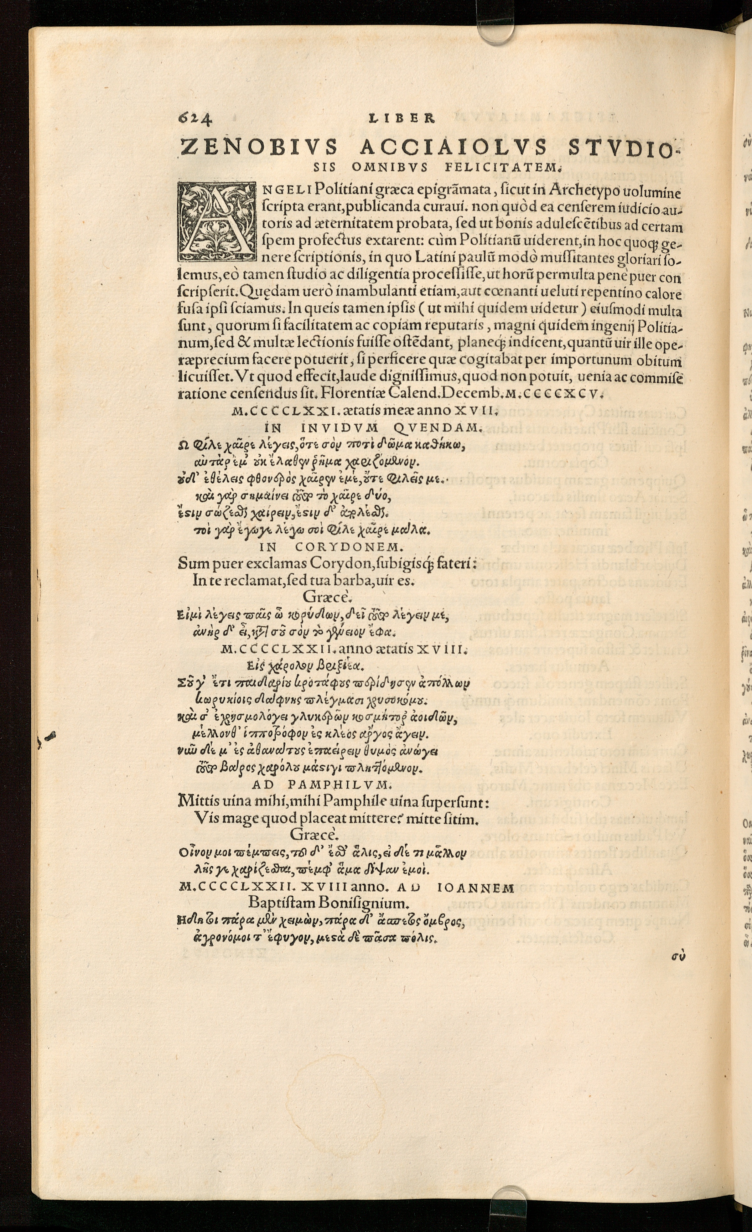 Angeli Politiani opera, quae quidem extitere hactenus, omnia, longe emendatus quam usquam antehac expressa : ; Quibus accessit historia de coniuratione Pactiana in familiam Medicam, elegantissimè conscripta : quorum omnium ordinem post Politiani elogia invenies : addito una indice memorabilium copiosissimo
