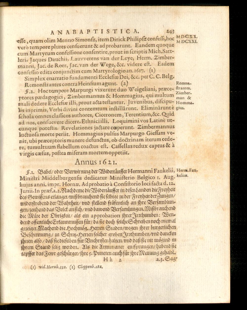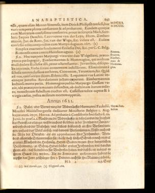 Annales anabaptistici hoc est, Historia universalis de anabaptistarum origine, progressu, factionibus & schismatis, paradoxis, tumultibus, colloquiis, pacificationibus, locis & sedibus, scriptis hinc illinc emissis, edictis & iudiciis, ac quicquid praeterea ad rem facere videtur : His praemissa prolegomena 1. Ad lectorem. 2. de variis Anabaptistarum sectis tractatio duplex. 3. collatio cum veteribus haereticis. 4. de Donatistis. 5. quomodo tractandi eiusmodi homines : una cum indice copioso / Adornata a Ioh. Henrico Ottio Tigurino