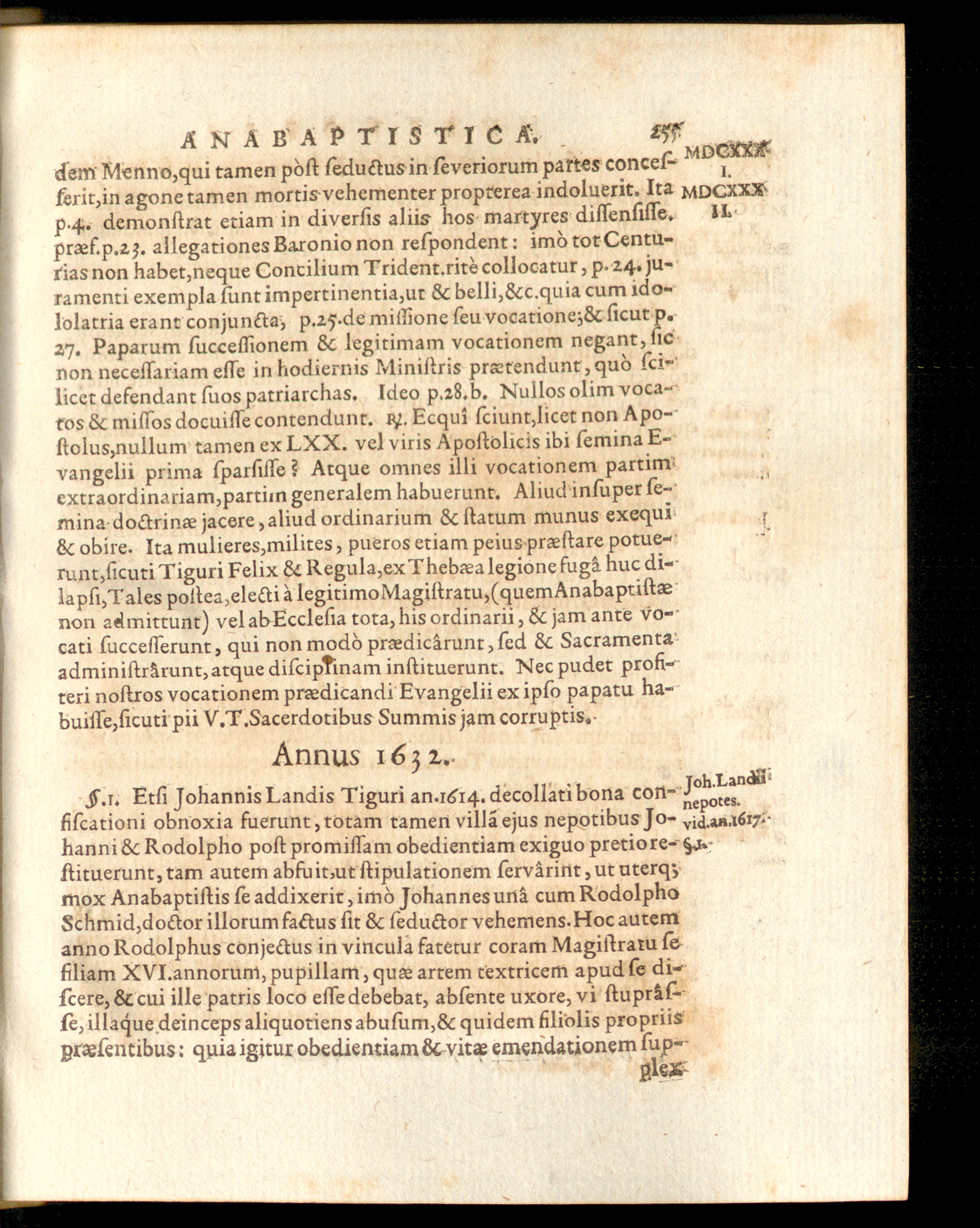 Annales anabaptistici hoc est, Historia universalis de anabaptistarum origine, progressu, factionibus & schismatis, paradoxis, tumultibus, colloquiis, pacificationibus, locis & sedibus, scriptis hinc illinc emissis, edictis & iudiciis, ac quicquid praeterea ad rem facere videtur : His praemissa prolegomena 1. Ad lectorem. 2. de variis Anabaptistarum sectis tractatio duplex. 3. collatio cum veteribus haereticis. 4. de Donatistis. 5. quomodo tractandi eiusmodi homines : una cum indice copioso / Adornata a Ioh. Henrico Ottio Tigurino