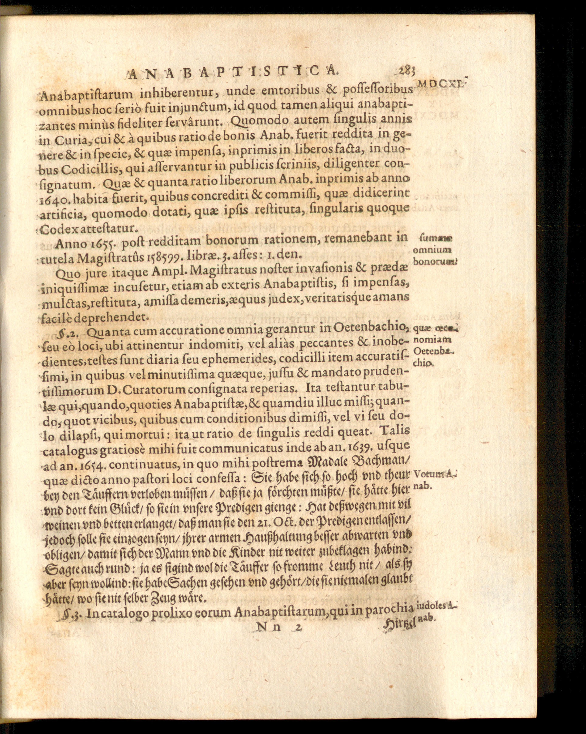 Annales anabaptistici hoc est, Historia universalis de anabaptistarum origine, progressu, factionibus & schismatis, paradoxis, tumultibus, colloquiis, pacificationibus, locis & sedibus, scriptis hinc illinc emissis, edictis & iudiciis, ac quicquid praeterea ad rem facere videtur : His praemissa prolegomena 1. Ad lectorem. 2. de variis Anabaptistarum sectis tractatio duplex. 3. collatio cum veteribus haereticis. 4. de Donatistis. 5. quomodo tractandi eiusmodi homines : una cum indice copioso / Adornata a Ioh. Henrico Ottio Tigurino