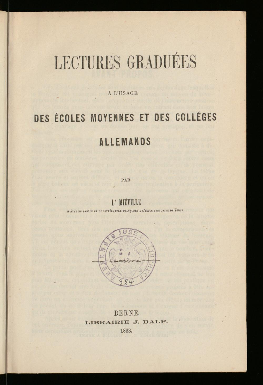 MAITRE DE LANGUE ET DE LITTÉRATURE FRANÇAISES A l’ÉCOLE CANTONALE DE BERNE.