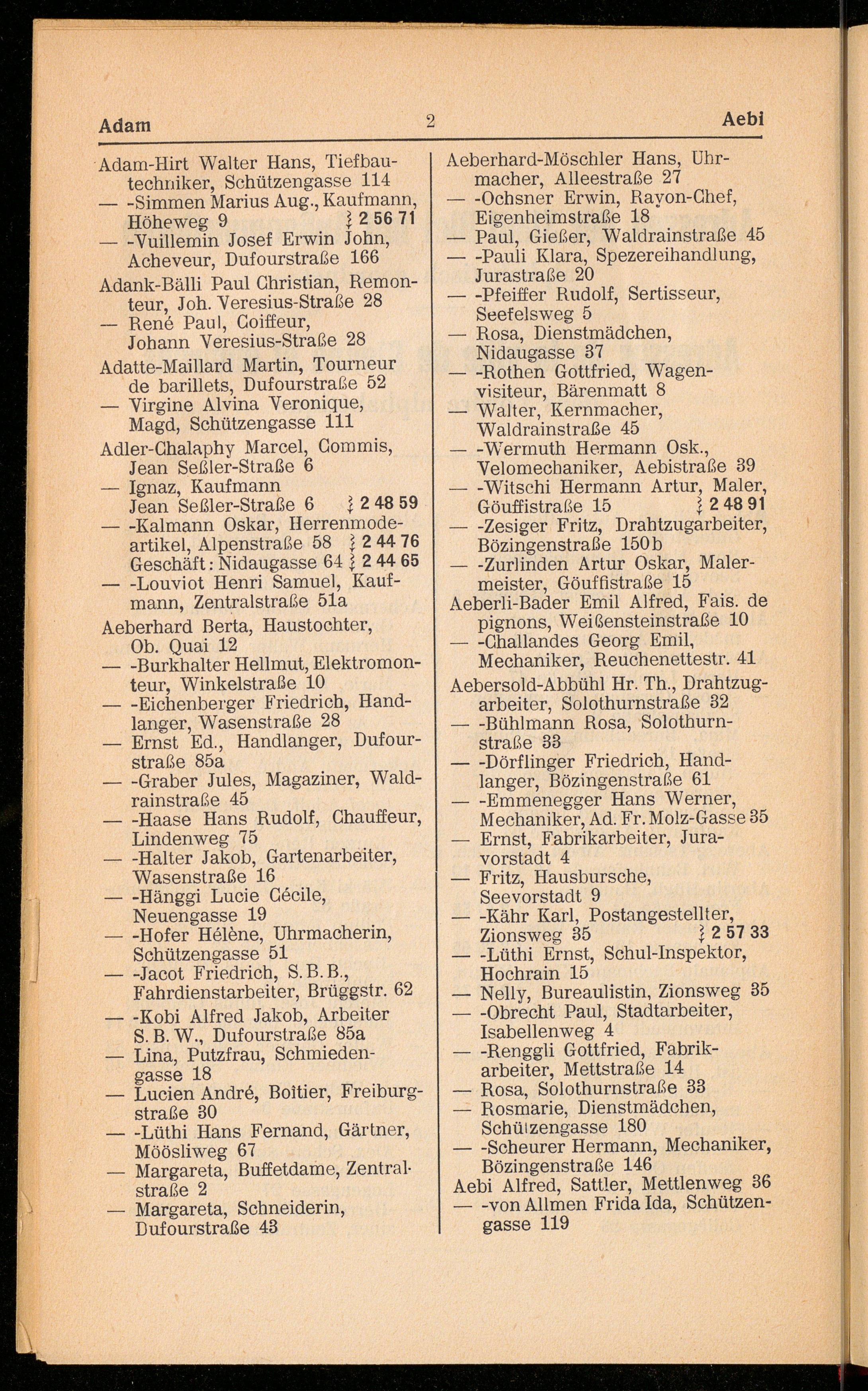 Adressen der Stadt Biel mit Außenquartieren alphabetisch geordnet / Adresses de la ville de Bienne et environs dans l'ordre alphabétique