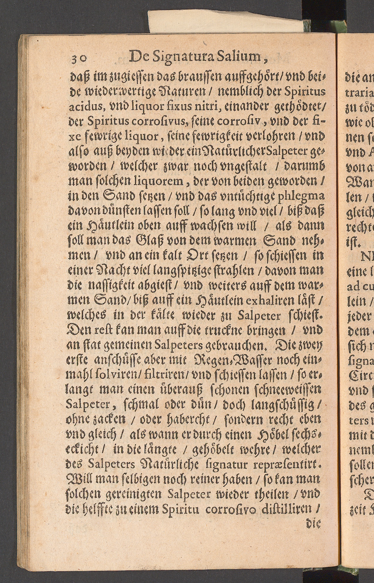 daß im zugießen das brausten auffgehort/ vnd HUde wirderwerüge Naturen / nemblich der Spiritusaciöus, vnd li^uor 6xus nitri, einander gechödttt/der Spiritus corrolivus, seine corroliv , vnd der la-xe fewrige liquor , seine fewrigkeic verlohren / vndalso auß beyden wieder emNatürlicherSalpeter gc»worden / welcher zwar noch vngestalt / darumbman solchen liquorem , der von beiden geworden /in den Sand seyen / vnd das vnküchtlge phlegmadavon dünsten lassen soll / so lang vnd viel / biß daßein Häuklein oben auff wachsen will / als dannsoll man das Glaß von dem warmen Sand neh,men/ vnd an ein kalk Ort seyen - so schieffen ineiner Nacht viel langspiyige strahlen / davon mandie naffigkeir abgiest/ vnd wetters auff dem war,men Sand/ biß auff ein Hautlein exhalircn last /welches in der kalte wieder zu Salpeter schieß.Den rest kan man auffdie truckne bringen / vndan stak gemeinen Salpeters gebrauchen. Die zweyerste anschaffe aber mit Regen-Wasser noch ein-mahl folviwt/ filtrirat/ vnd schiessen lassen t so er,langt man einen überauß schonen schneeweißenSalpeter, schmal oder dun / doch langschüffig/ohne zacken / oder habercht / sondern recht ebenvnd gleich / als wann er durch einen Hobel sechs,eckichr/ in die langte / gehobelt wehre/ welcherdes Salpeters Natürliche signatur reprajfenf iff •Will man selbigen noch reinerhaben / so kan mansolchen gereinigten Salpeter wieder theilen / vnddie helsste zu einem Spiritu corrosivo ckiüilliren /