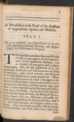 T H E Question, whether there are Witchesor not, is not matter of vain Specula-tion, or of indifferent Moment; butan Inquiry of very great and weightyImportance. For, on the resolution of it, de*fends the Authority and just Execution of someof our Laws ; and which is more, our Religionin its main Doctrines is nearly concerned. Thereis no one, that is not very much a stranger to theW orld but knows how Atheism and Infidelity haveadvanced in our days, and how openly they nowoare to shew themselves in Asserting and Difpu-ll| ig their vile Cause. Particularly the difiinUi -° n of the S oul from the Body , the Being of Spirits,‘ Ul d a Future Life are Assertions extreamly de-vised and opposed by the Men of this sort, and iflose those Articles, all Religion comes to no*^hing. They are clearly and fully Asserted in thesacred Oracles, but those Wits have laid aside