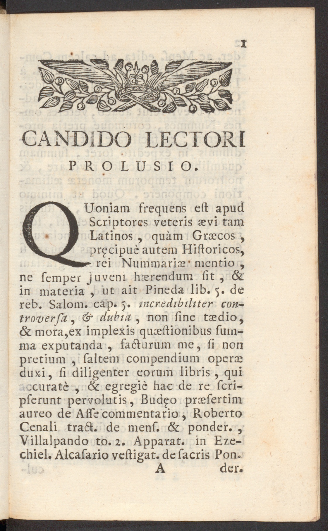 Q Uoniam frequens est apudScriptores veteris aevi tamLatinos , quam Graecos ,pr^cipue autem Historicos,-- rei Nummariae* mentio ,ne semper juvem haerendum sit , &in materia , ut ait Pineda lib. 5. dereb. Salorn. cap. 5. incredibiliter con-troversa , & dubia , non sine taedio,& mora,ex implexis quaestionibus sum-ma exputanda , facturum me, si nonpretium , saltem compendium operaeduxi, si diligenter eorum libris, qui„curate , & egregie hac de re scri-pserunt pervolutis, Bud^o praesertimaureo de Asse commentario , RobertoCenali tract. de mens. & ponder. ,Villalpando to. 2. Apparat, in Eze-chiel. Alcafario vestigat, de sacris Pon.