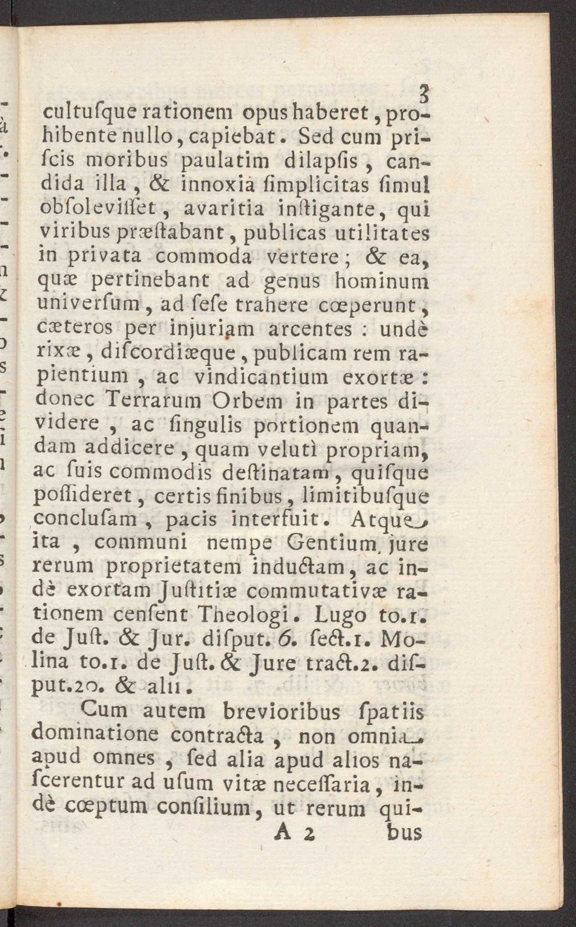 cultusque rationem opus haberet, pro-hibente nullo, capiebat. Sed cum pri-scis moribus paulatim dilapsis , can-dida illa , & innoxia simplicitas simulobsolevisset, avaritia instigante, quiviribus praestabant, publicas utilitatesin privata commoda vertere; & ea,quae pertinebant ad genus hominumuniversum , ad sese trahere coeperunt,caeteros per injuriam arcentes : underixae , discordiaeque, publicam rem ra-pientium , ac vindicantium exortae :donec Terrarum Orbem in partes di-videre , ac singulis portionem quan-dam addicere , quam veluti propriam,ac suis commodis destinatam , quisqueposiideret, certis finibus, limitibusqueconclusam , pacis interfuit. Atque-»ita , communi nempe Gentium, jurererum proprietatem inductam, ac in-de exortam Justitiae commutativae ra-tionem censent Theologi. Lugo to.r.de Just. & Jur. di sput. 6. sect.i. Mo-lina to.r. de Just. & Jure tract.2. dis-put.20. & alu.