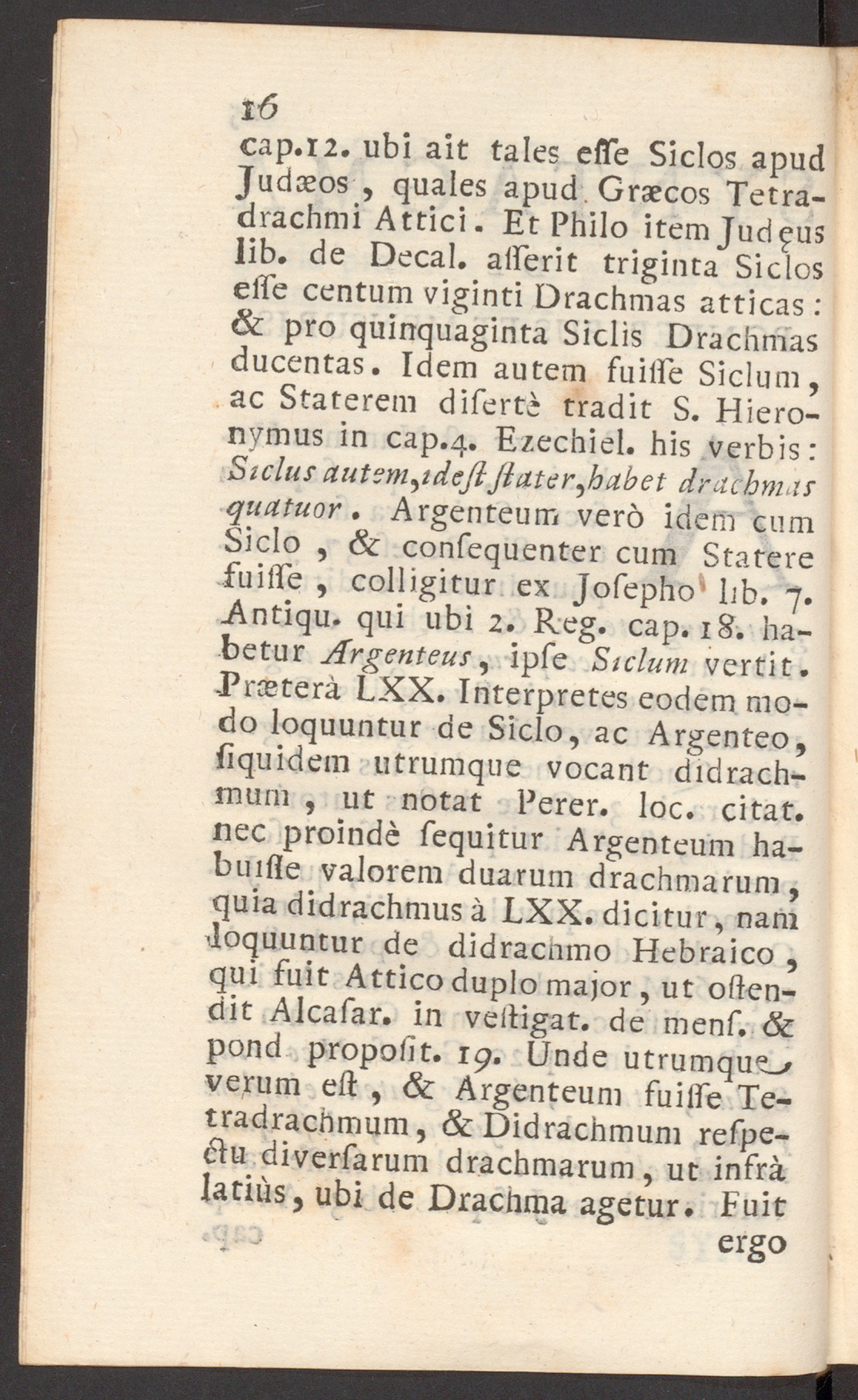 cap.i2. ubi ait tales effe Siclos apudJudoeos , quales apud. Graecos Tetra-drachmi Attici. Et Philo itemjud^uslib. de Decal. alserit triginta Siclosesse centum viginti Drachmas atticas :& pro quinquaginta Siclis Drachmasducentas. Idem autem fuisse Siclum,ac Staterem diserte tradit S. Hiero-nymus in cap.4. Ezechiel. his verbis:Siclus autem,ideflflater, habet drachmasquatuor . Argenteum verö idem cumSiclo , & consequenter cum Staterefuisse , colligitur ex Josepho' hb. 7..Antiqu- qui ubi 2. Reg. cap. iS. ha-betur Argenteus , ipse Siclum vertit.Proeterä LXX. Interpretes eodem mo-do loquuntur de Siclo, ac Argenteo,siquidem utrumque vocant didrach-mum , ut notat Perer. loc. citat,nec proinde sequitur Argenteum ha-buisle valorem duarum drachmarum,quia didrachmus a LXX. dicitur, namdoquuntur de didracnmo Hebraico ,qui fuit Attico duplo major, ut osten-dit Alcasar. in vestigat, de mens. &pond propolit. r9. Unde utrumque_/verum est , & Argenteum fuisse Te-tradrachmum, &Didrachmum respe-ctu diversarum drachmarum, ut infrä.latius, ubi de Drachma agetur. Fuit
