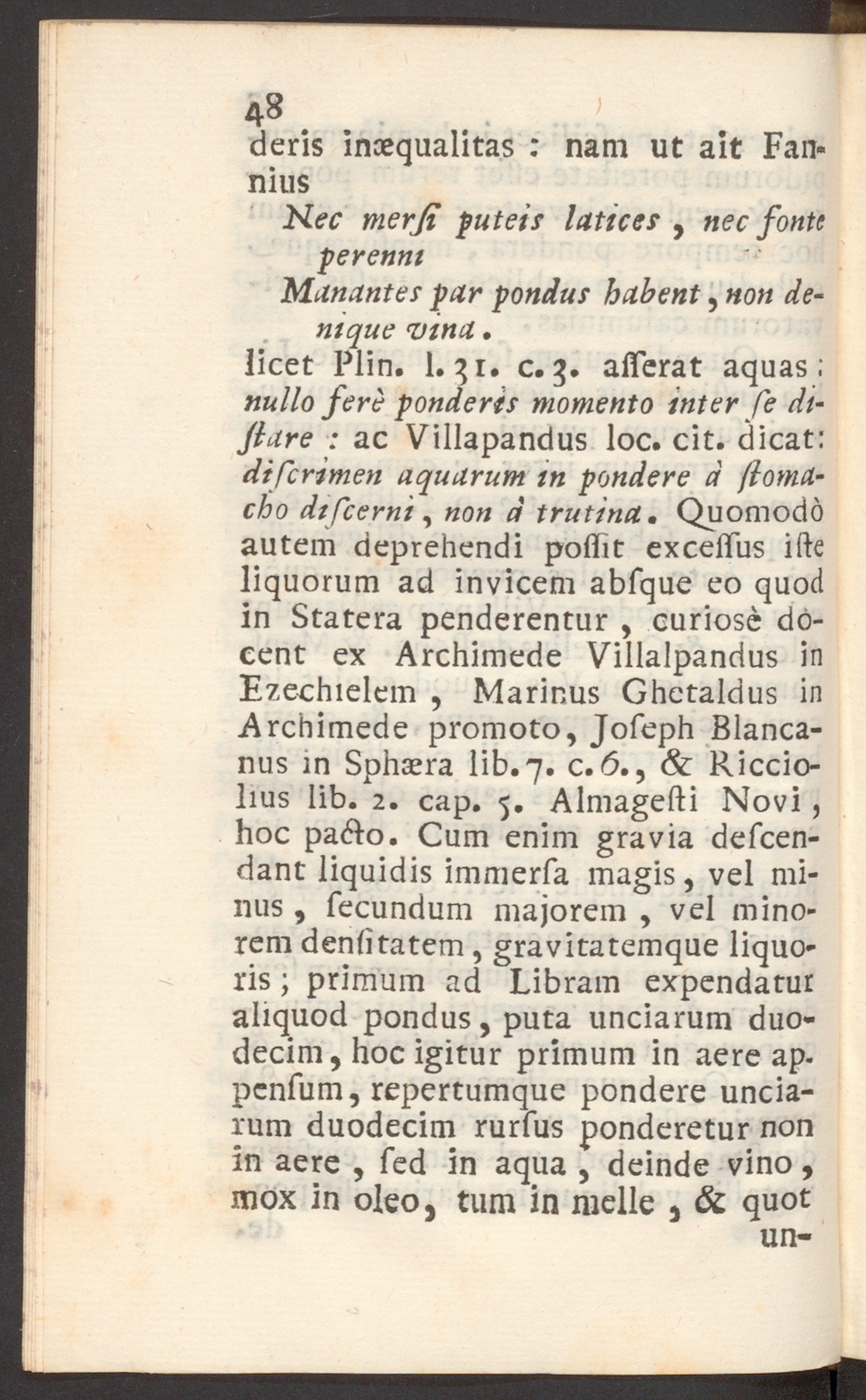 licet Plin. 1.31. c.3. asserat aquas ;nullo fere ponderis momento inter se di-stare : ac Villapandus loc. cit. dicat:discrimen aquarum tn pondere d stoma-cho discerni , non d trutina • Quomodoautem deprehendi possit excessus isteliquorum ad invicem absque eo quodin Statera penderentur , curiose do-cent ex Archimede Villalpandus inEzechielem , Marinus Ghctaldus inArchimede promoto, Joseph Blanca-nus in Sphaera lib. 7. c.6 ., & Riccio-lius lib. 2. cap. 5. Almagesti Novi,hoc pacto. Cum enim gravia descen-dant liquidis immersa magis, vel mi-nus , secundum majorem , vel mino-rem densitatem, gravitatemque liquo-ris ; primum ad Libram expendaturaliquod pondus, puta unciarum duo-decim, hoc igitur primum in aere ap.pensum, repertumque pondere uncia-rum duodecim rursus ponderetur nonin aere , sed in aqua , deinde vino,mox in oleo, tum in meile , & quot