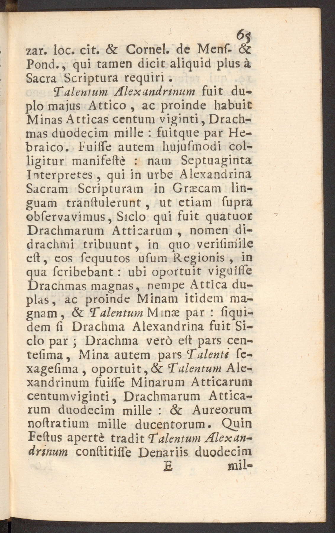 Talentum Alexandrinum fuit du-plo majus Attico, ac proinde habuitMinas Atticas centum viginti, Drach-mas duodecim mille : fuitque par He-braico. Fuisse autem hujusmodi col-ligitur manifeste : nam SeptuagintaInterpretes , qui in urbe AlexandrinaSacram Scripturam in Graecam lin-guam transtulerunt , ut etiam supraobservavimus, Siclo qui fuit quatuorDrachmarum Atticarum , nomen di-ci rachmi tribuunt, in quo verisimileest, eos sequutos usum Regionis, inqua scribebant : ubi oportuit viguisseDrachmas magnas, nempe Attica du-plas, ac proinde Minam itidem ma-gnam, & Talentum Minae par : siqui-dem si Drachma Alexandrina fuit Si-clo par ; Drachma vero est pars cen-tesima, Mina autem pars Talenti se-xagesima , oportuit,& Talentum Ale-xandrinum fuisse Minarum Atticarumcentumviginti, Drachmarum Attica-rum duodecim mille : & Aureorumnostratium mille ducentorum. QuinFestus aperte tradit Talentum Alexan-drinum constitisse Denariis duodecim