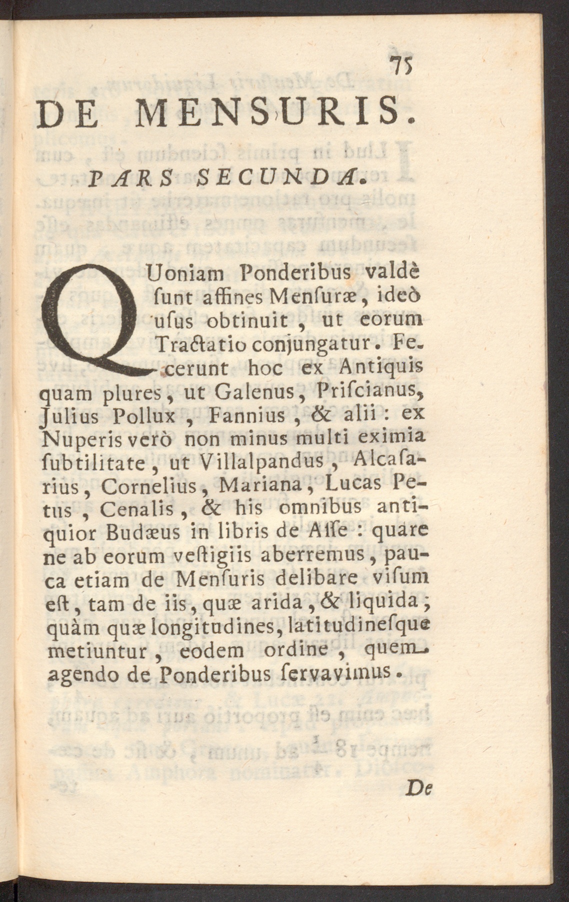 Q Uoniam Ponderibus valdesunt affines Mensurae, idcöusus obtinuit , ut eorumTractatio conjungatur. Fe.»-xerunt hoc ex Antiquisquam plures, ut Galenus, Priscianus,Julius Pollux , Fannius , & alii : exNuperis vero non minus multi eximiasubtilitate , ut Villalpandus , A lea fa-ri us , Cornelius, Mariana, Lucas Fe-tus , Cenalis , & his omnibus anti-quior Budaeus in libris de Alse : quarene ab eorum vestigiis aberremus, pau-ca etiam de Mensuris delibare visumest, tam de iis, quoe arida , & liquida •quam quae longitudines, latitudinesquemetiuntur , eodem ordine , quem-,agendo de Ponderibus servavimus.
