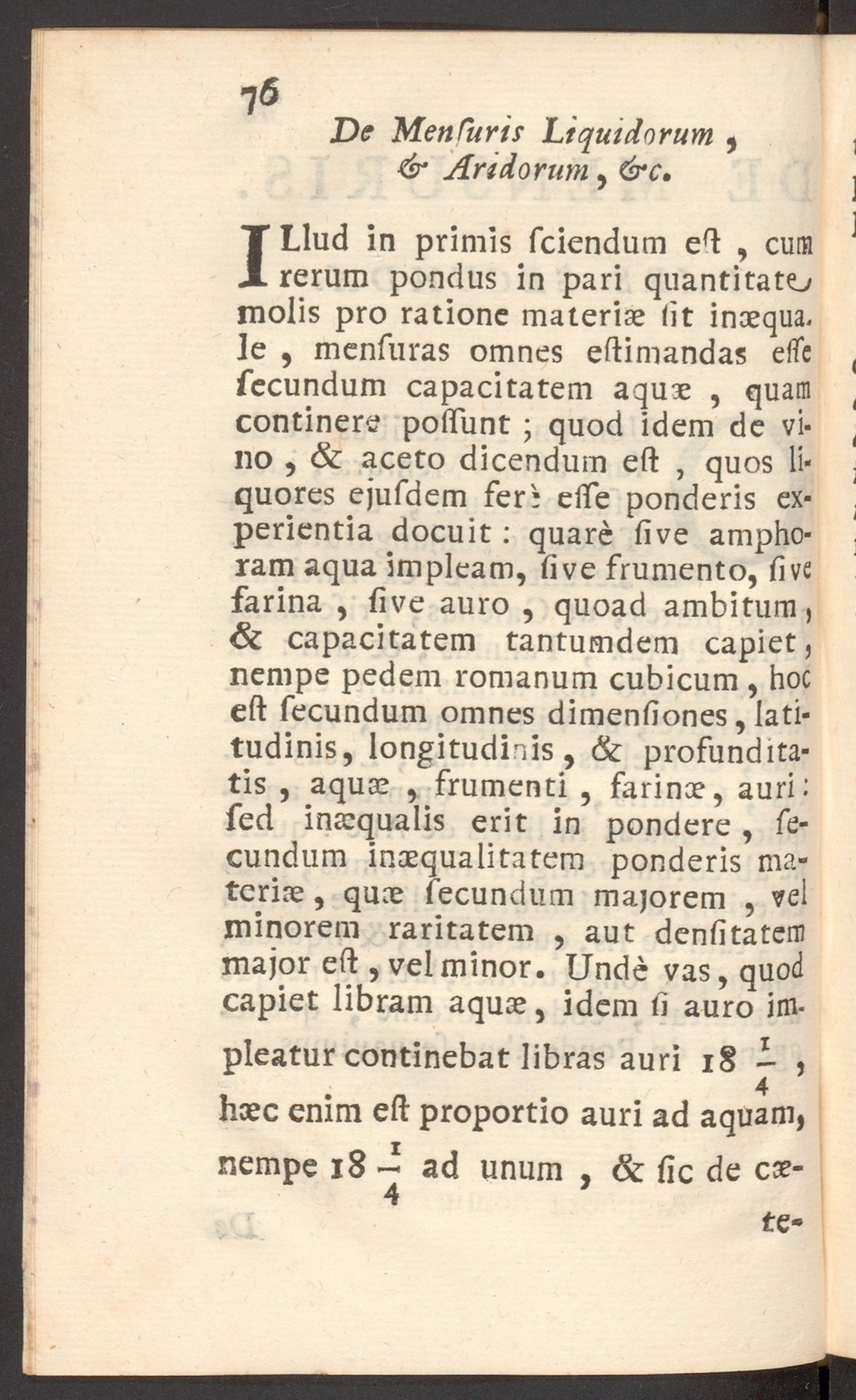 I Llud in primis sciendum est , cumrerum pondus in pari quantitatomolis pro ratione materiae Iit inaequa,le , mensuras omnes estimandas esse ,secundum capacitatem aquae , quam (continere possunt ; quod idem de vi- (no , & aceto dicendum est , quos li- ;quores ejusdem fer* esse ponderis ex- .perientia docuit: quare sive ampho-ram aqua impleam, sive frumento, sivefarina , sive auro , quoad ambitum,