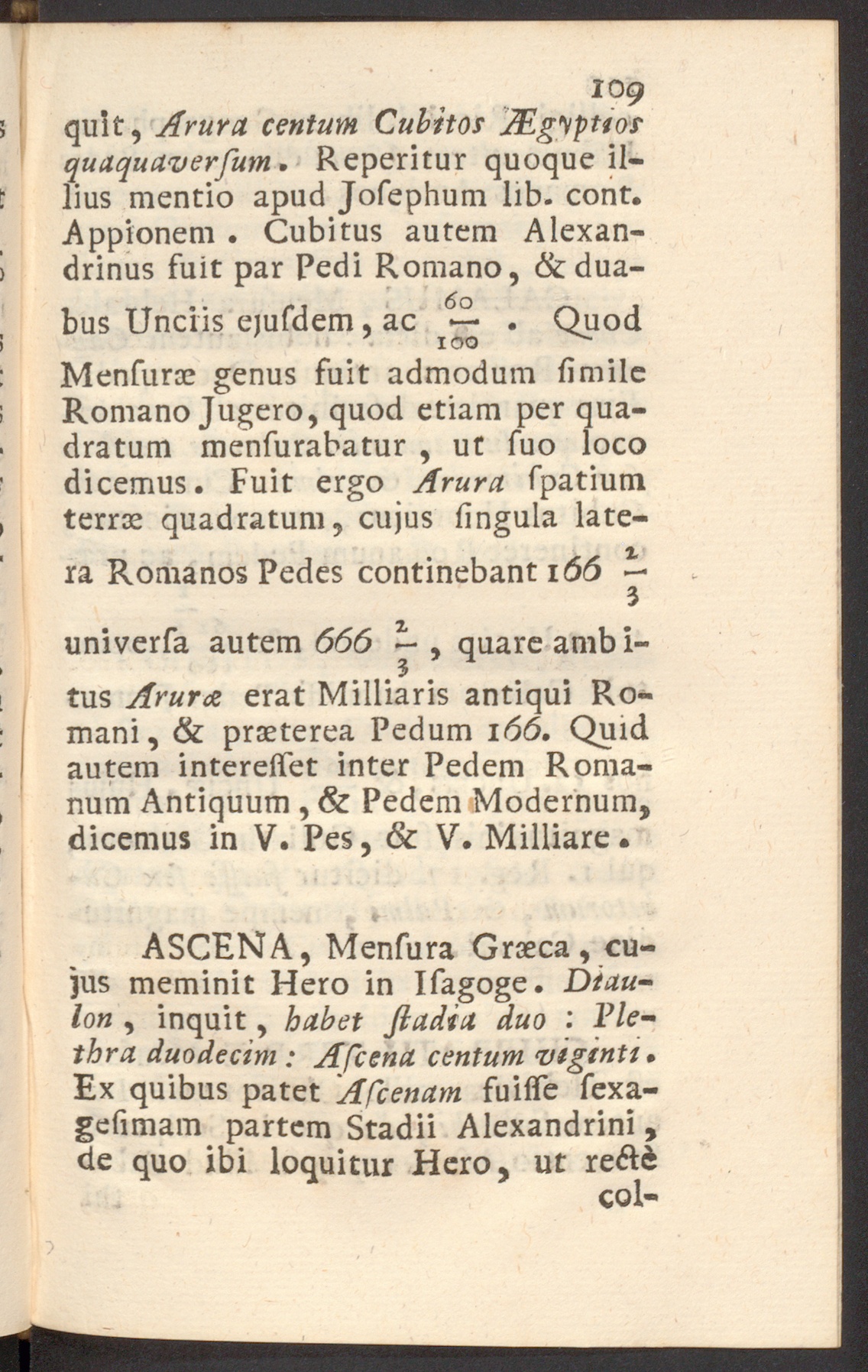 tus Arura erat Milliaris antiqui Ro-mani, & praeterea Pedum 166. Quidautem intereffet inter Pedem Roma-num Antiquum , & Pedem Modernum,dicemus in V. Pes, & V. Milliare.