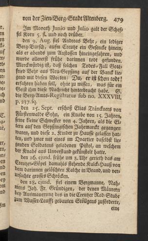 r. s Im Monath ^unio und ^sullo galt der Schefsm fel Korn 5. st. und noch drüber,en den 9. Au§. fiel Andreas Bchr, ein ledigerk- ! Berg-Bursch, aufm Creutze ein Gesencke hinein,uf als er abends zum Anstössen hineingefahren, und:rs wurde allererst frühe darinnen todt gefunden,ets Merckwürdig ist, daß solchen Todes-Fall Got-t-r.n fried Behr aus Neu-Geyßing auf der Banck lies