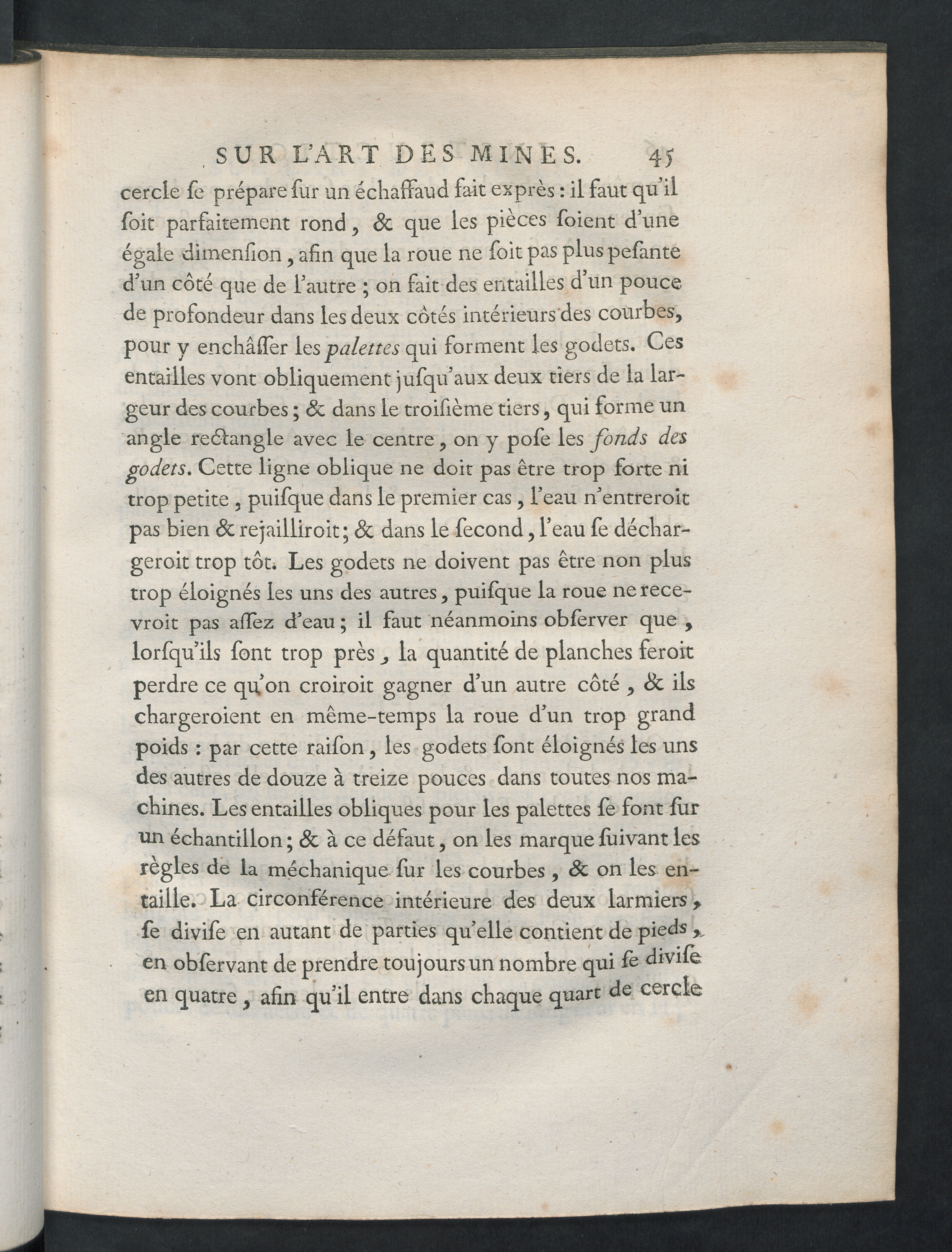 . SUR L’ART DES MINES. 4>cercle fe prépare fur un échaffaud fait exprès : il faut qu’ilfoit parfaitement rond, Sc que les pièces foient d’uneégale dimenfion, afin que la roue ne foit pas plus pefanted’un coté que de l’autre ; on fait des entailles d un poucede profondeur dans les deux cotés intérieurs des courbes,pour y enchâlfer les palettes qui forment les godets. Cesentailles vont obliquement jufqu’aux deux tiers de la lar-geur des courbes ; Sc dans le troifième tiers, qui forme unangle reélangle avec le centre, on y pofe les fonds desgodets. Cette ligne oblique ne doit pas être trop forte nitrop petite , puifque dans le premier cas , l’eau n’entreroitpas bien Sc rejailliroit; Sc dans le fécond, l’eau fe déchar-geroit trop tôt. Les godets ne doivent pas être non plustrop éloignés les uns des autres, puifque la roue ne rece-vroit pas allez d’eau ; il faut néanmoins obfèrver que ,lorfqu ils font trop près, la quantité de planches feroitperdre ce qifon croiroit gagner d’un autre côté , Sc ilschargeroient en même-temps la roue d’un trop grandpoids : par cette raifon, les godets font éloignés les unsdes autres de douze à treize pouces dans toutes nos ma-chines. Les entailles obliques pour les palettes fe font furun échantillon ; Sc à ce défaut, on les marque fùivant lesréglés de la méchanique fur les courbes , St on les en-taille. La circonférence intérieure des deux larmiers,fe divife en autant de parties quelle contient de piedsen obfervant de prendre toujours un nombre qui fe divifeen quatre, afin qu’il entre dans chaque quart de cercle