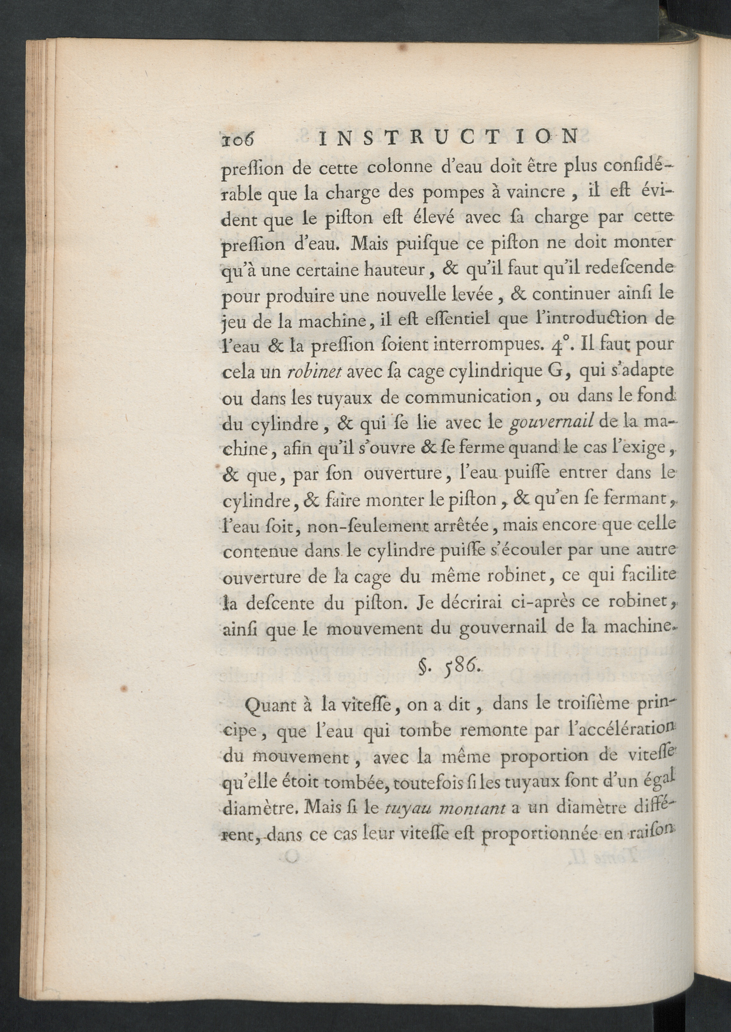 preftion de cette colonne d’eau doit être plus confidé-rabie que la charge des pompes à vaincre , it eft évi-dent que le pifton eft élevé avec fa charge par cettepreflîon d’eau. Mais puifque ce pifton ne doit monterqu’à une certaine hauteur, & qu’il faut qu’il redefcendepour produire une nouvelle levée, & continuer ainfi lejeu de la machine, il eft efïèntiel que l’introduétion del’eau & la preftion foient interrompues. 4 0 . Il faut pourcela un robinet avec fa cage cylindrique G, qui s’adapteou dans les tuyaux de communication, ou dans le fonddu cylindre, & qui fe lie avec le gouvernail de la ma-chine , afin qu’il s’ouvre & fe ferme quand le cas l’exige,& que, par fon ouverture, l’eau puiffe entrer dans lecylindre, & faire monter le pifton y & qu’en fe fermant 9l’eau foit, non-feulement arrêtée, mais encore que cellecontenue dans le cylindre puiftè s’écouler par une autreouverture de l'a cage du même robinet, ce qui faciliteia defcente du pifton. Je décrirai ci-après ce robinet ,<ainfi que le mouvement du gouvernail de la. machine-