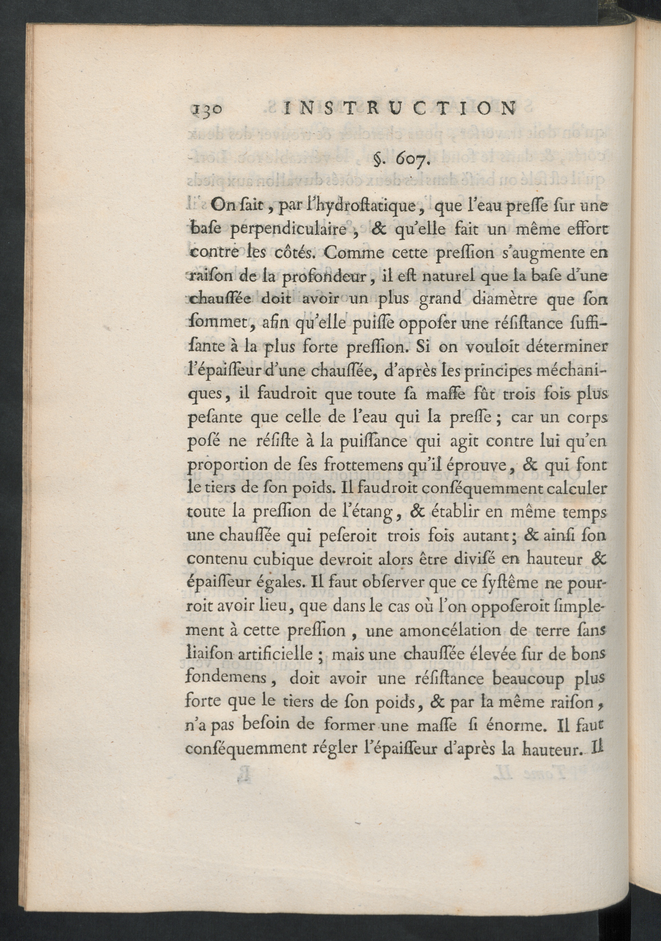 ’ " On fait, par l’hydroftatique , que l’eau preffe fur unebafo perpendiculaire ’, Sc quelle fait un même effortcontre les côtés. Comme cette preffion s’augmente enraifon de la profondeur, il elt naturel que la bafo d’unechauffée doit avoir un plus grand diamètre que fonfommet, afin qu'elle puilîè oppofer une réfiflance fuffi-fante à la plus forte preffion. Si on vouloit déterminerl’épaifieur d’une chauffée, d’après les principes méchani-ques, il faudroit que toute fà malle fût trois fois pluspefante que celle de l’eau qui la preffe ; car un corpspofé ne réfifte à la puilîânce qui agit contre lui qu’enproportion de fes frottemens qu’il éprouve, & qui fontle tiers de fon poids. Il faudroit confëquemment calculertoute la preffion de l’étang, St établir en même tempsune chauffée qui peforoit trois fois autant ; & aînfi foncontenu cubique devroit alors être divifé en hauteur SCépailféur égales. Il faut obforver que ce fyftême ne pour-roit avoir lieu, que dans le cas où l’on oppoforoit Ample-ment à cette preffion , une amoncélation de terre finsliaifon artificielle ; mais une chauffée élevée for de bonsfondemens, doit avoir une réfiftance beaucoup plusforte que le tiers de fon poids, & par la même raifon ,n’a pas befoin de former une malle fi énorme. Il fautconfëquemment régler i’épaiffeur d’après la hauteur, li