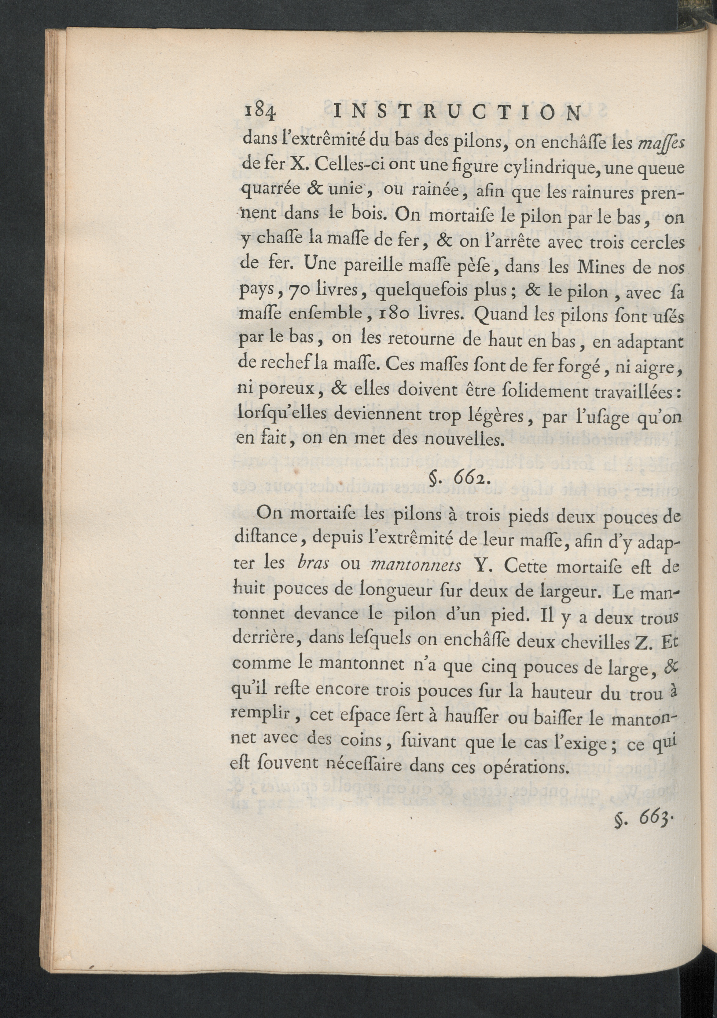 On mortaife les pilons à trois pieds deux pouces dediftance, depuis l’extrémité de leur mafie, afin d’y adap-ter les bras ou mantonnets Y. Cette mortaife eft dehuit pouces de longueur fur deux de largeur. Le man-tonnet devance le pilon d’un pied. Il y a deux trousderrière, dans lefquels on enchâfiè deux chevilles Z. Etcomme le mantonnet n’a que cinq pouces de large, &qu’il relie encore trois pouces fur la hauteur du trou àremplir, cet efpace fert à haufièr ou bailler le manton-net avec des coins, fuivant que le cas l’exige ; ce q üleft fouvent néceftaire dans ces opérations.