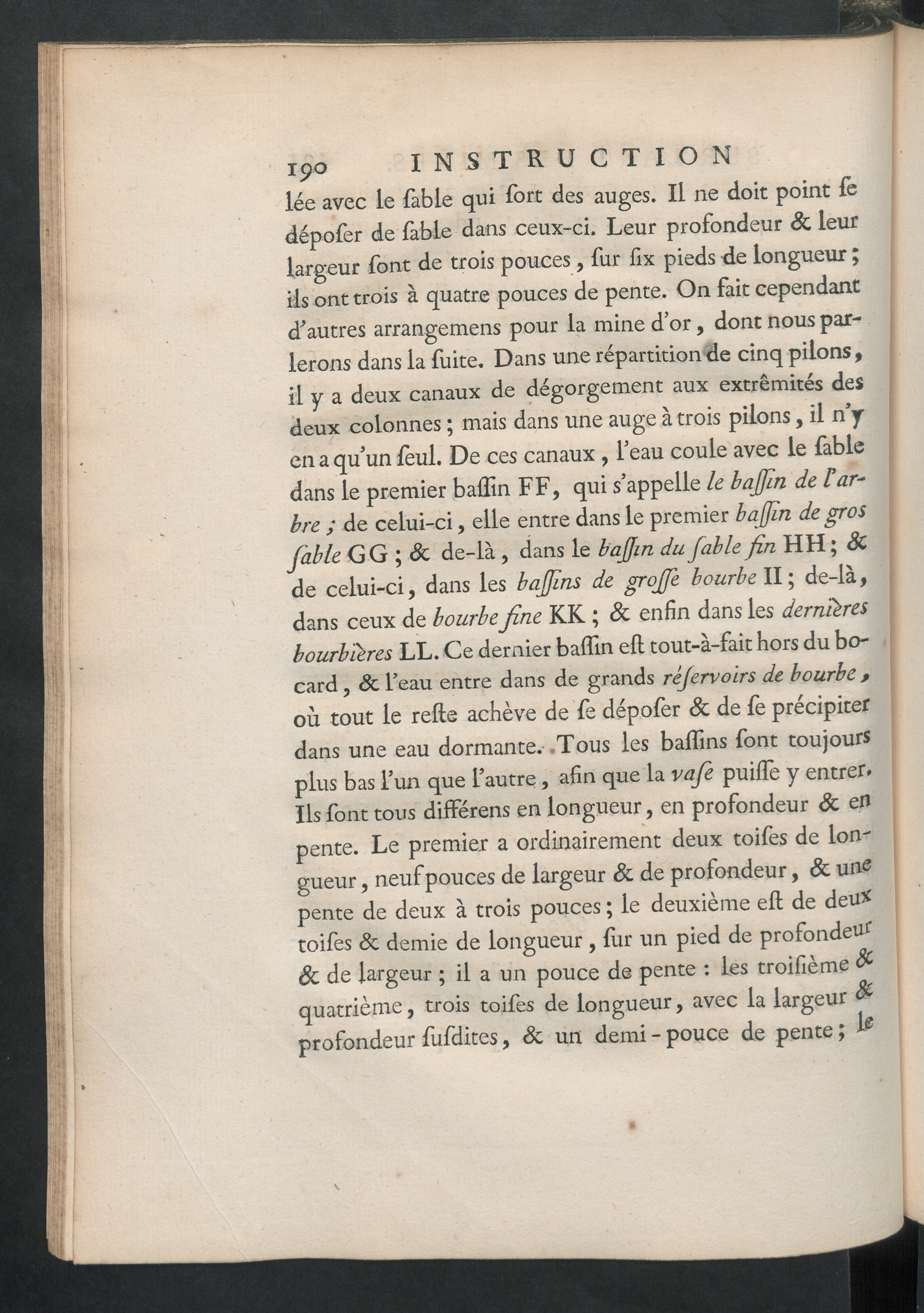 i 9 o INSTRUCTIONlée avec le fable qui fort des auges. Il ne doit point fcdépofer de fable dans ceux-ci. Leur profondeur 8c leurlargeur font de trois pouces, fur fix pieds de longueur ;ils ont trois à quatre pouces de pente. On fait cependantd'autres arrangemens pour la mine d’or, dont nous par-lerons dans la fuite. Dans une répartition de cinq pilons,il y a deux canaux de dégorgement aux extrémités desdeux colonnes ; mais dans une auge à trois pilons, il n’yen a qu’un fèul. De ces canaux, l’eau coule avec le fabledans le premier baffin FF, qui s’appelle le b afin de tar-bre ; de celui-ci, elle entre dans le premier baffin de grosfable GG ; 8c de-là, dans le baffin du fable fin HH ; &de celui-ci, dans les bajjins de grojfe bourbe II; de-là,dans ceux de bourbe fine KK ; 8c enfin dans les dernièresbourb 'iëres LL. Ce dernier baffin eft tout-à-fait hors du bo-card , 8c l’eau entre dans de grands rèfervoirs de bourbe ,où tout le relie achève de fe dépofer & de fè précipiterdans une eau dormante. .Tous les baffins font toujoursplus bas l’un que l’autre, afin que la vaje puilîe y entrer»Ils font tous différens en longueur, en profondeur 8c eflpente. Le premier a ordinairement deux toifes de Ion"gueur, neuf pouces de largeur 8c de profondeur, 8c unepente de deux à trois pouces ; le deuxième eft de deu*toifes & demie de longueur , fur un pied de profondeur8c de largeur ; il a un pouce de pente : les troifième #quatrième, trois toifes de longueur, avec la largeur $profondeur fufdites, êc un demi - pouce de pente ;