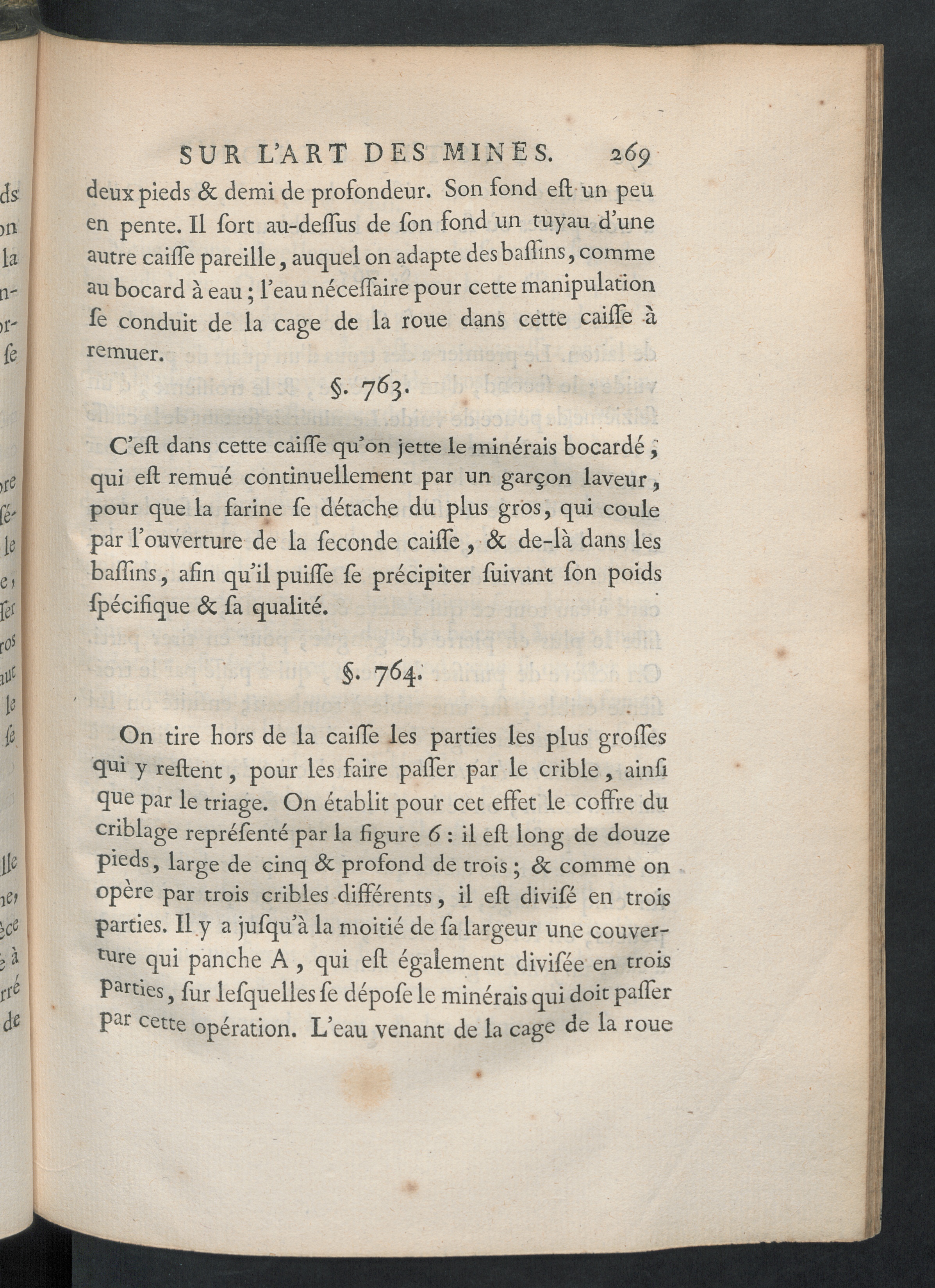 SUR L’ART DES MINES. 269deux pieds Sc demi de profondeur. Son fond eft un peuen pente. Il fort au-defîus de fon fond un tuyau d’uneautre caiffe pareille, auquel on adapte des badins, commeau bocard à eau ; l’eau nécelfaire pour cette manipulationfe conduit de la cage de la roue dans cette caiffe àremuer.
