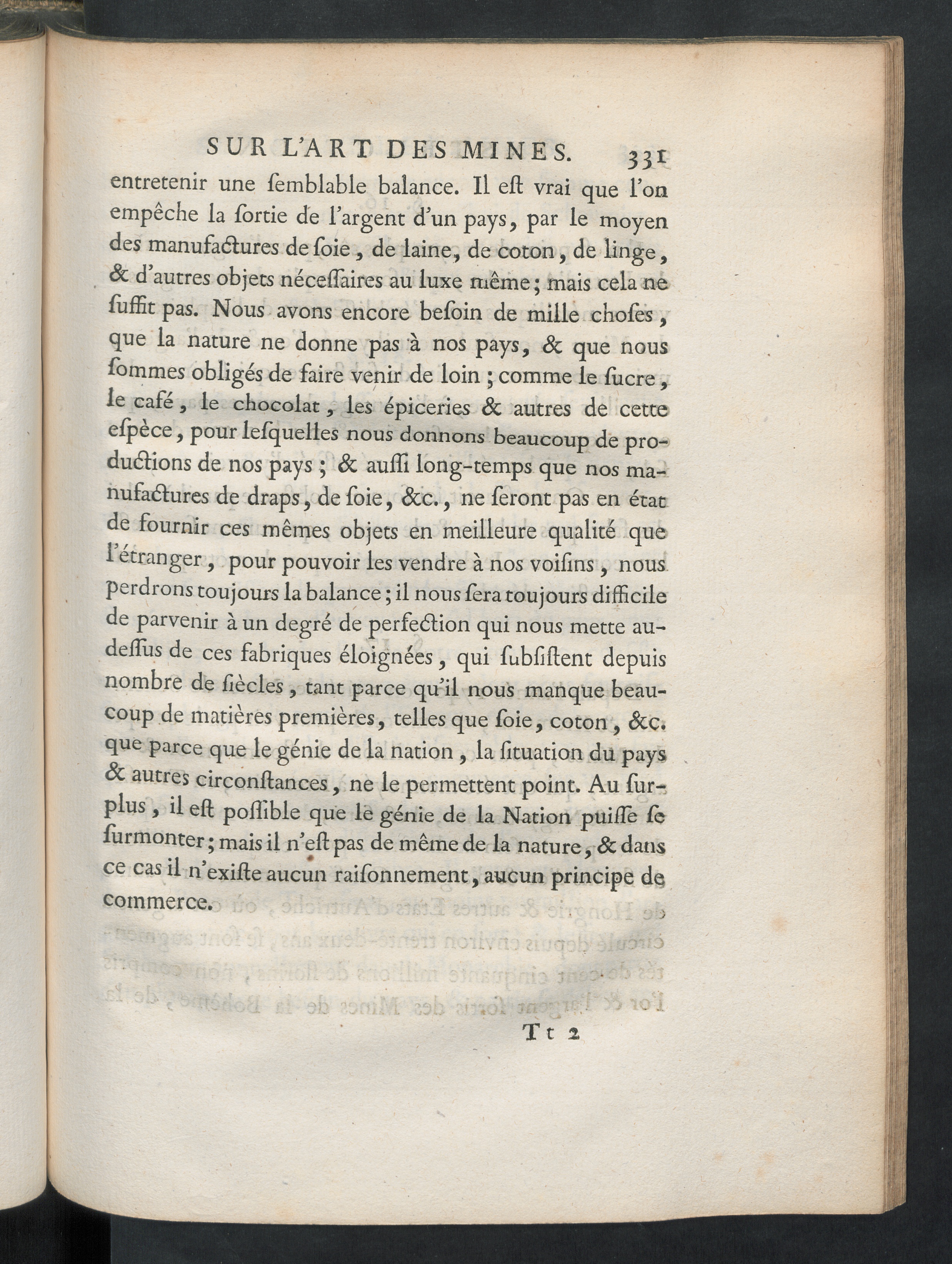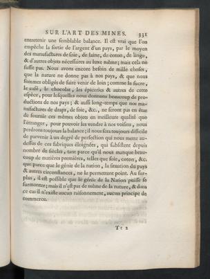 SUR L’ART DES MINES. 331entretenir une lèmblable balance. Il efl: vrai que Tonempêche la lortie de l’argent d’un pays, par le moyendes manufactures de foie , de laine, de coton, de linge,& d’autres objets néceffaires au luxe même ; mais cela nefùffit pas. Nous avons encore beloin de mille choies,que la nature ne donne pas à nos pays, 8c que nousIbtnmes obligés de faire venir de loin ; comme le lucre,le café, le chocolat, les épiceries Sc autres de cetteelpèce, pour lelquelles nous donnons beaucoup de pro-ductions de nos pays ; Sc aulïi long-temps que nos ma-nufactures de draps , de foie , Scc ., ne feront pas en étatde fournir ces mêmes objets en meilleure qualité que1 étranger, pour pouvoir les vendre à nos voilins, nousperdrons toujours la balance ; il nous fera toujours difficilede parvenir à un degré de perfeCtion qui nous mette au-deffus de ces fabriques éloignées, qui fubfiftent depuisnombre de liècles , tant parce qu’il nous manque beau-coup de matières premières, telles que foie, coton, Sc c.que parce que le génie de la nation , la fituation du paysSc autres circonltances, ne le permettent point. Au fur—plus , il elt pollible que le génie de la Nation puiile lelurmonter ; mais il n’ellpas de même de la nature, & dansce cas il n’exilte aucun raifonnement, aucun principe dqcommerce.