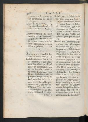 Baritel à chevaux. Defcriptionde fes parties, §. 417 jufqu’à420. Son effet, 421. Expé-rience en conféquence pourne pas furpaffer la force ôtle travail de chevaux , 422.B^üûe difpofition pour ne pasperdre de temps à vuider lesfacs, 423. Defcription de lacompofition des cables pources machines , 424. Son cal-cul , 42p. Tout fon poids,430. Comparaifon des diffé-rentes portions de la charge,431 ôt 43 2.