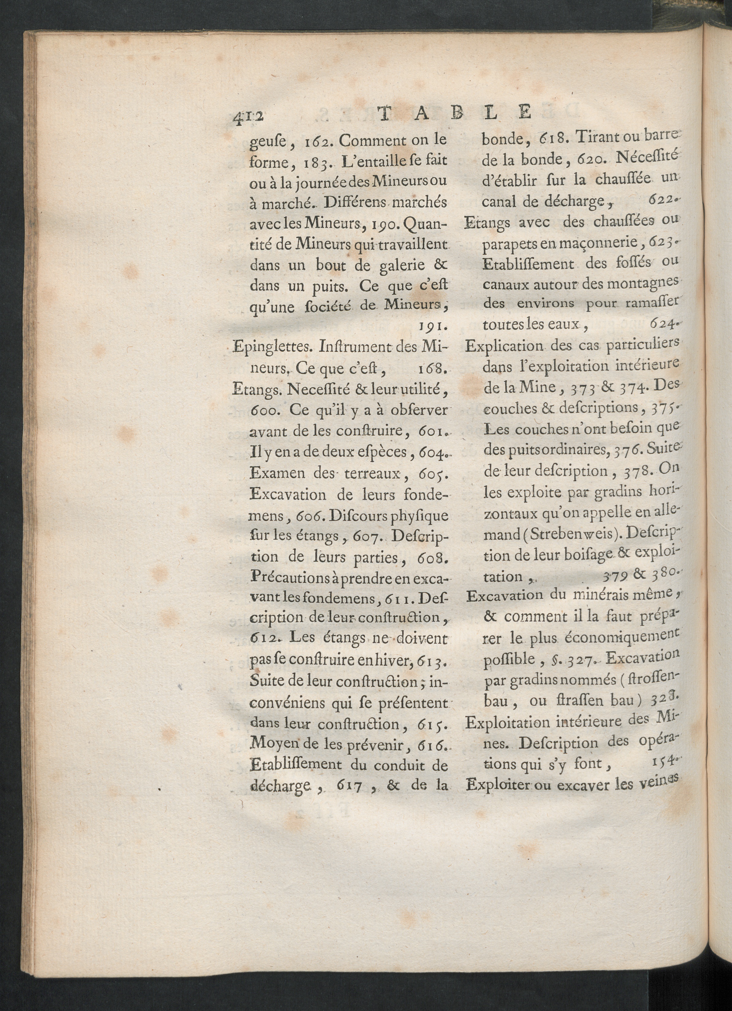 Explication des cas particuliersdans l’exploitation intérieurede la Mine, 373 & 374. Descouches & defcriptions, 373-Les couches n’ont befoin quedes puits ordinaires, 375. Suite-de leur defcription , 378. Oules exploite par gradins hori-zontaux qu’on appelle en aile*mand ( Strebenweis). Defcrip-tion de leur boifage ôc exploi-tation ,, 3-72 ôt 380.-