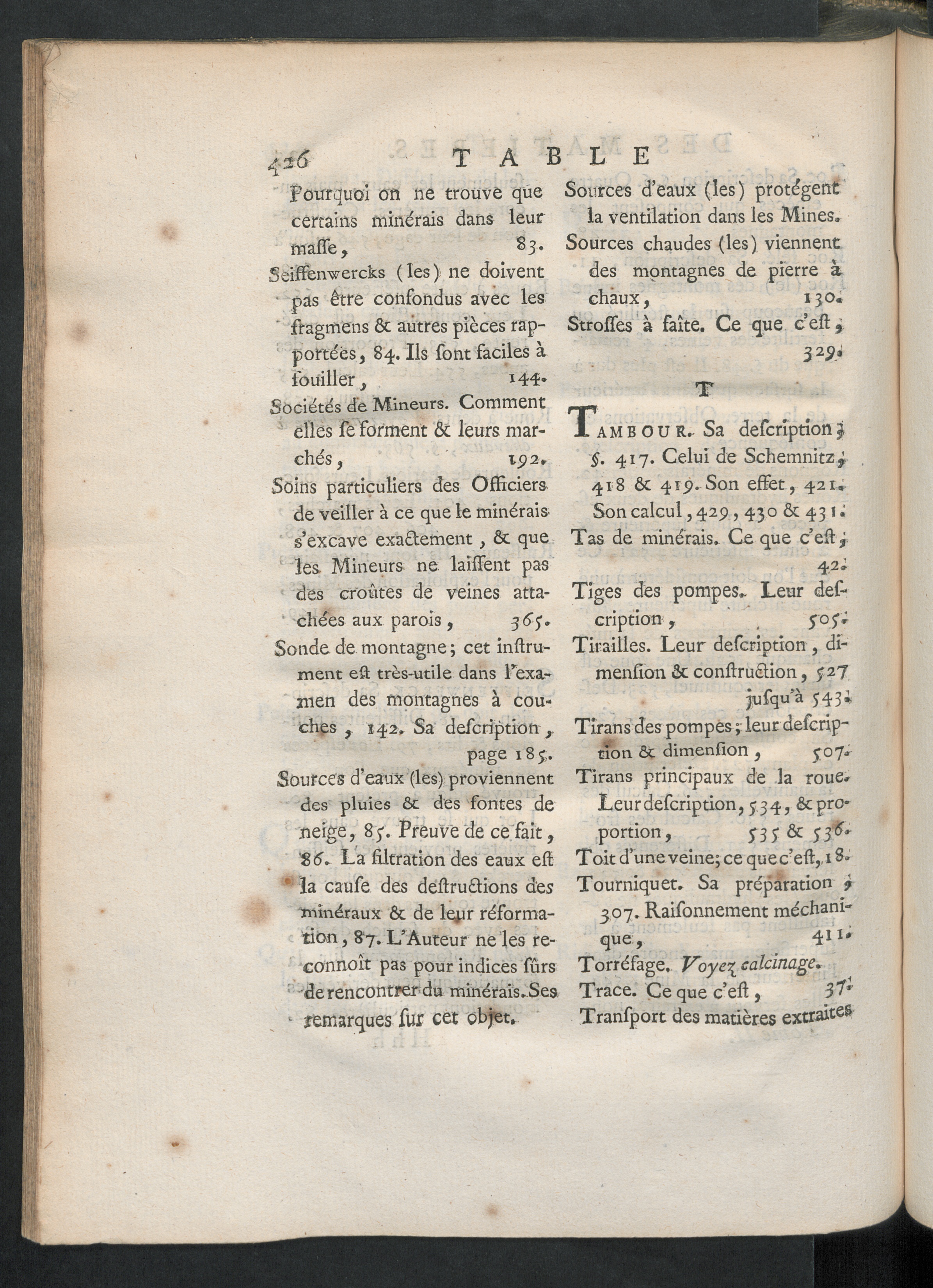 Tambour. . Sa defcription }§. 417. Celui de Schemnitzÿ418 & 419. Son effet, 421;Son calcul, 425), 430 & 431.'Tas de minérais» Ce que c’eft j