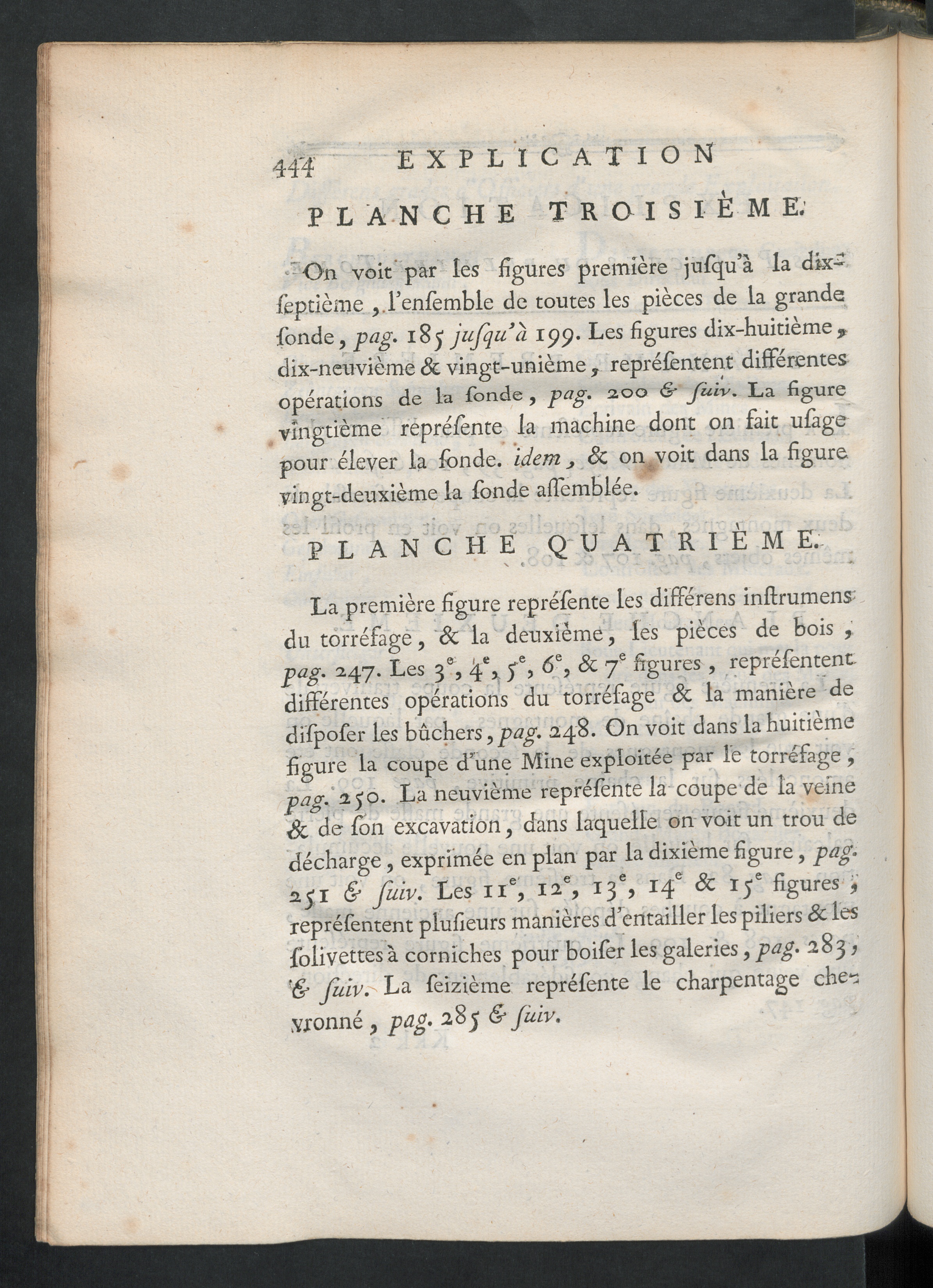 La première figure repréfonte les différens inftrumens ;du torréfage, Sc la deuxième, les pièces de bois ,pag. 247. Les 3®, 4% 5% 6% Sc 7 e figures , repréfentent.différentes opérations du torréfage Sc la manière dedifpofer les bûchers, pag. 2,48. On voit dans la huitièmefigure la coupe d’une Mine exploitée par le torréfage,pag. nÿo. La neuvième repréfonte la coupe de la veineSc de fon excavation, dans laquelle on voit un trou dedécharge, exprimée en plan par la dixième figure, pag.2.$i & fuiv. Les 11% 12% 13 e , 14 e & 15 e figures *repréfentent plufieurs manières d’entailler les piliers Sc lesfolivettes à corniches pour boifer les galeries, pag. 283 ,'& fuiv. La feizième repréfonte le charpentage che*syronné y pag. 284 & fàiv.