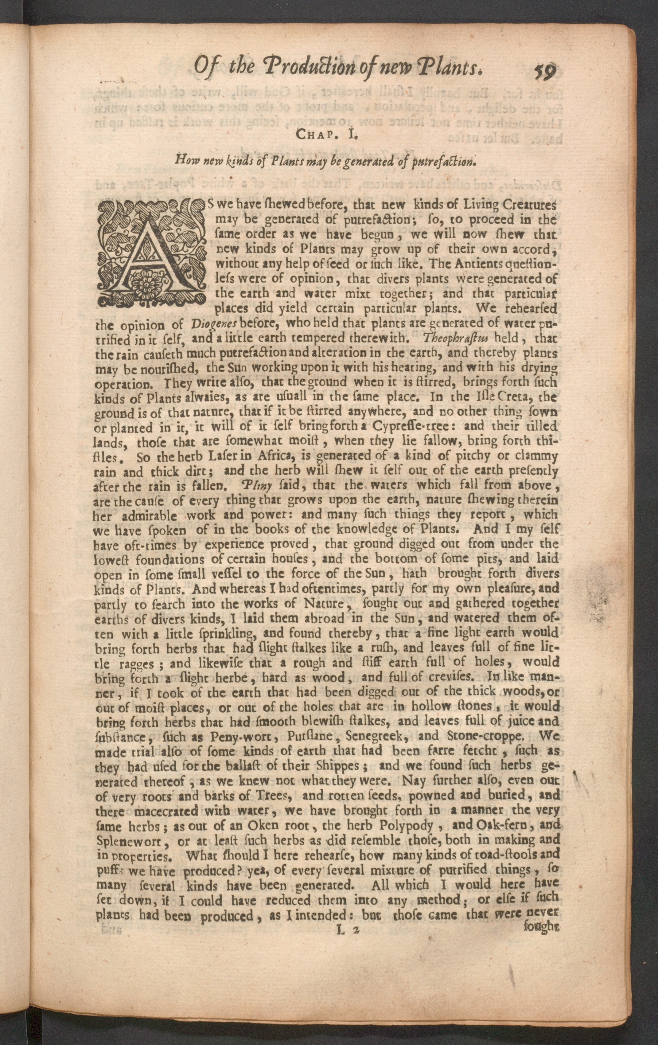 S we have shewed before, that new kinds of Living Creaturesmay be generated of putrefaction; so, to proceed in thefame order as we have begun, we will now shew thatnew kinds of Plants may grow up of their own accord,without any help of feed or l'uch like. The Antientsqneliion-less were of opinion, that divers plants were generated ofthe earth and water mixc together; and that particuiafplaces did yield certain particular plants. We rehearsedthe opinion of Diogenes before, who held that plants arc generated of water pn-trified in it self, ana a little earth tempered therewith. Theophrasttu held, thatthe rain causeth much putrefaction and alteration in the earth, and thereby plantsmay be nourished, the Sun working upon it with his heating, and with his dryingoperation. They write also, that the ground when it is stirred, brings forth suchkinds of Plants alwaies, as are usuall in the same place. In the isleCreta, theground is of that nature, that if it be stirred anywhere, and no other thing sownor planted in it, it Will of it self bring forth a Cypreffe-trec: and their tilledlands, those that are somewhat moist, when they lie fallow, bring forth thi-stles. So the herb Laser in Africa, is generated of a kind of pitchy or clammyrain and thick dirt; and the herb will shew it self out of the earth presentlyafter the rain is fallen. ‘Pltnj said, that the waters which fall from above,are the cause of every thing that grows upon the earth, nature shewing thereinher admirable work and power: and many such things they report, whichwe have spoken of in the books of the knowledge of Plants. And I my selfhave oft-times by experience proved, that ground digged out from under thelowest foundations of certain houses, and the bottom of some pits, and laidopen in some small vessel to the force of the Sun , hath brought forth diverskinds of Plants. And whereas I had oftentimes, partly for my own pleasure, andpartly to search into the works of Nature , sought out and gathered togetherearths of divers kinds, I laid them abroad in the Sun, and watered them of-ten with a little sprinkling, and found thereby, that a fine light earth wouldbring forth herbs that had flight strikes like a rush, and leaves full of fine lit-tle ragges ; and likewise that a rough and stiff earth full of holes, wouldbring forth a flight herbe, hard as wood, and full of crevises. In like man-ner, if I took of the earth that had been digged out of the thick woods,orout of moist places, or out of the holes that are in hollow stones , it wouldbring forth herbs that had smooth Newish strikes, and leaves full of juice andsubstance, such as Peny-wort, Puiflme, Sencgreek, and Stone-croppe. Wemade trial also of some kinds of earth that had been farre fctcht, such asthey had used for the ballast of their Shippes; and we found such herbs ge-nerated thereof , as we knew not what they were. Nay further also, even outof very roots and barks of Trees, and rotten seeds, powned and buried, andthere macccrated with water, we have brought forth in a manner the veryfame herbs; as out of an Oken root, the herb Polypody , and Oak-fern, andSplenewort, or at least such herbs as did resemble those, both in making andin properties. What should I here rehearse, how many kinds of toad-stools andpufT we have produced? yea, of every several mixture of putrified things, somany several kinds have been generated. All which I would here haveset down, if I could have reduced them into any method - or else if sochplants had been produced, as I intended: but those came that were never