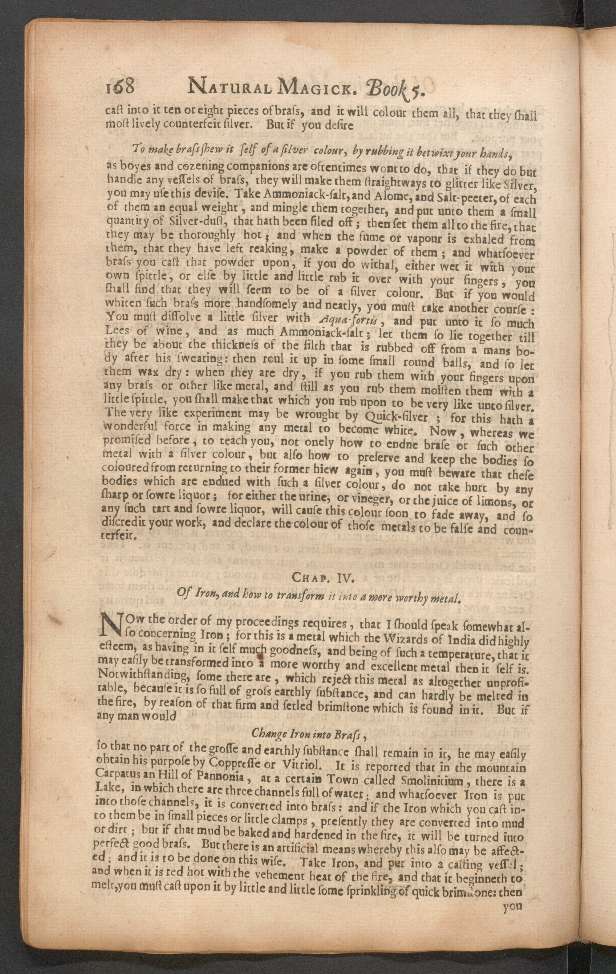 N Ow the order of my proceedings requires, that I should speak somewhat al-so concerning Iron; for this is a metal which the Wizards of India did highlyesteem, as having in it self much goodness, and being of such a temperature, that itmay easily be transformed into a more worthy and excellent metal then it self is.Notwithstanding, some there are , which reject this metal as altogether unprofi-table, because it is so full of gross earthly substance, and can hardly be melted inthe fire, by reason of that firm and sctlcd brimstone which is found in it. But ifany man would